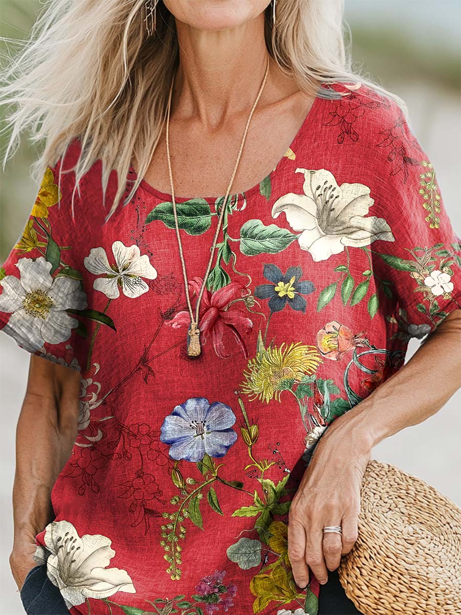 Women's Vintage Flower Print Casual Cotton And Linen 3/4 Sleeve Shirt