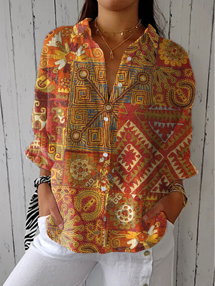 Women's Vintage Flowers Art Print Casual Linen V-neck Shirt