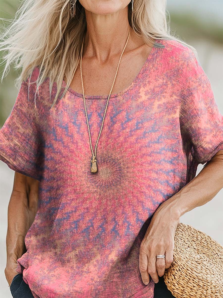 Women's Vintage Kaleidoscope Tie Dye Print Casual Cotton And Linen 3/4 Sleeve Shirt