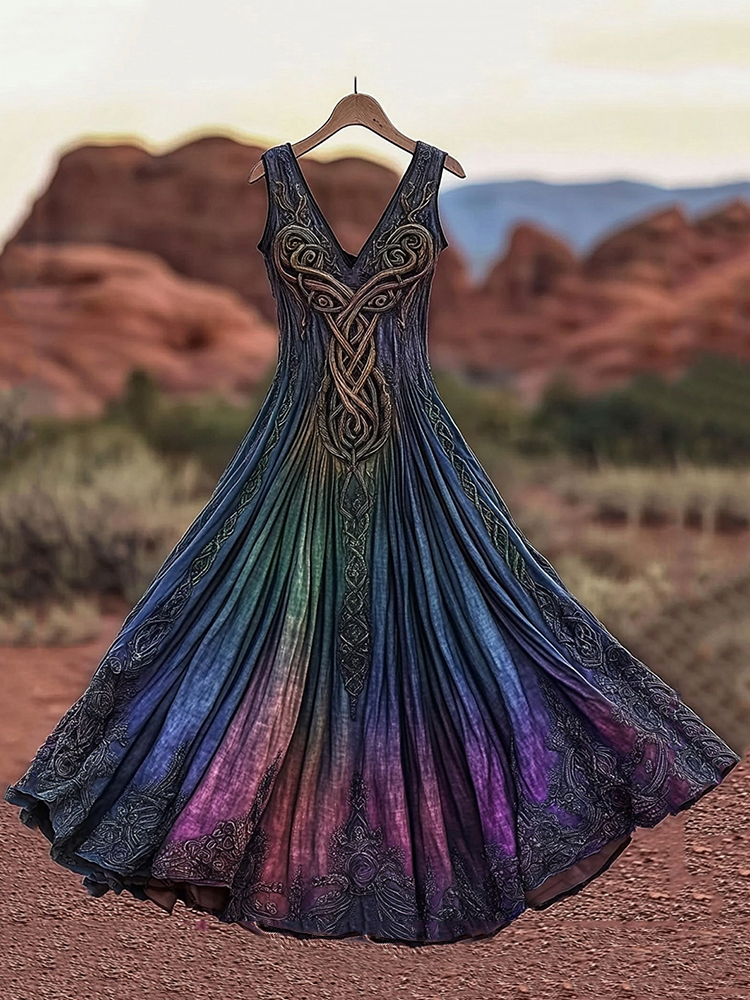 Women's Vintage Viking Celtic Knot Gradient Art Linen Midi Dress