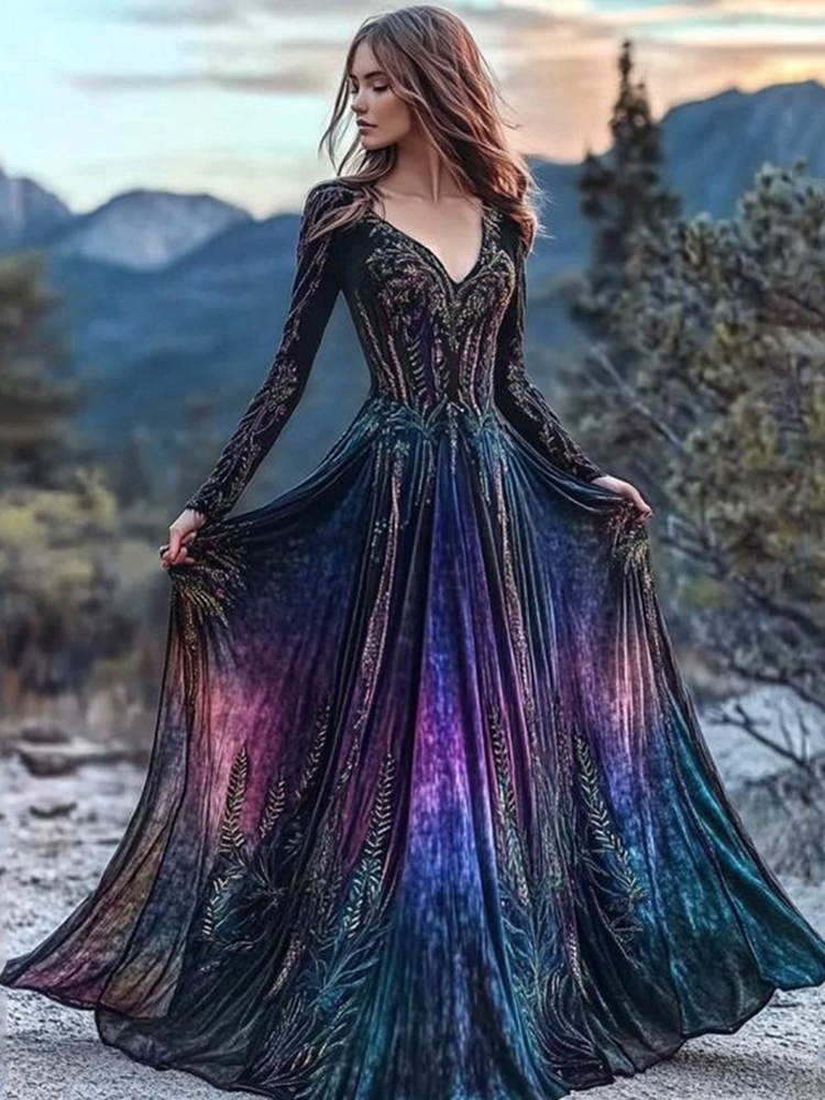Women's Viking Purple Gradient Pattern V Neck Long Sleeve Maxi Dress