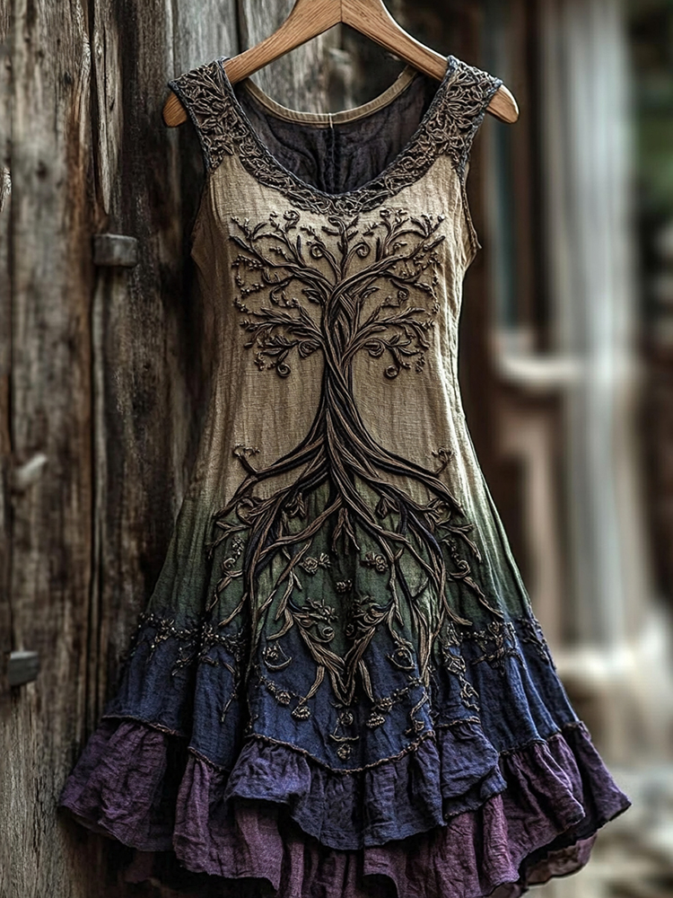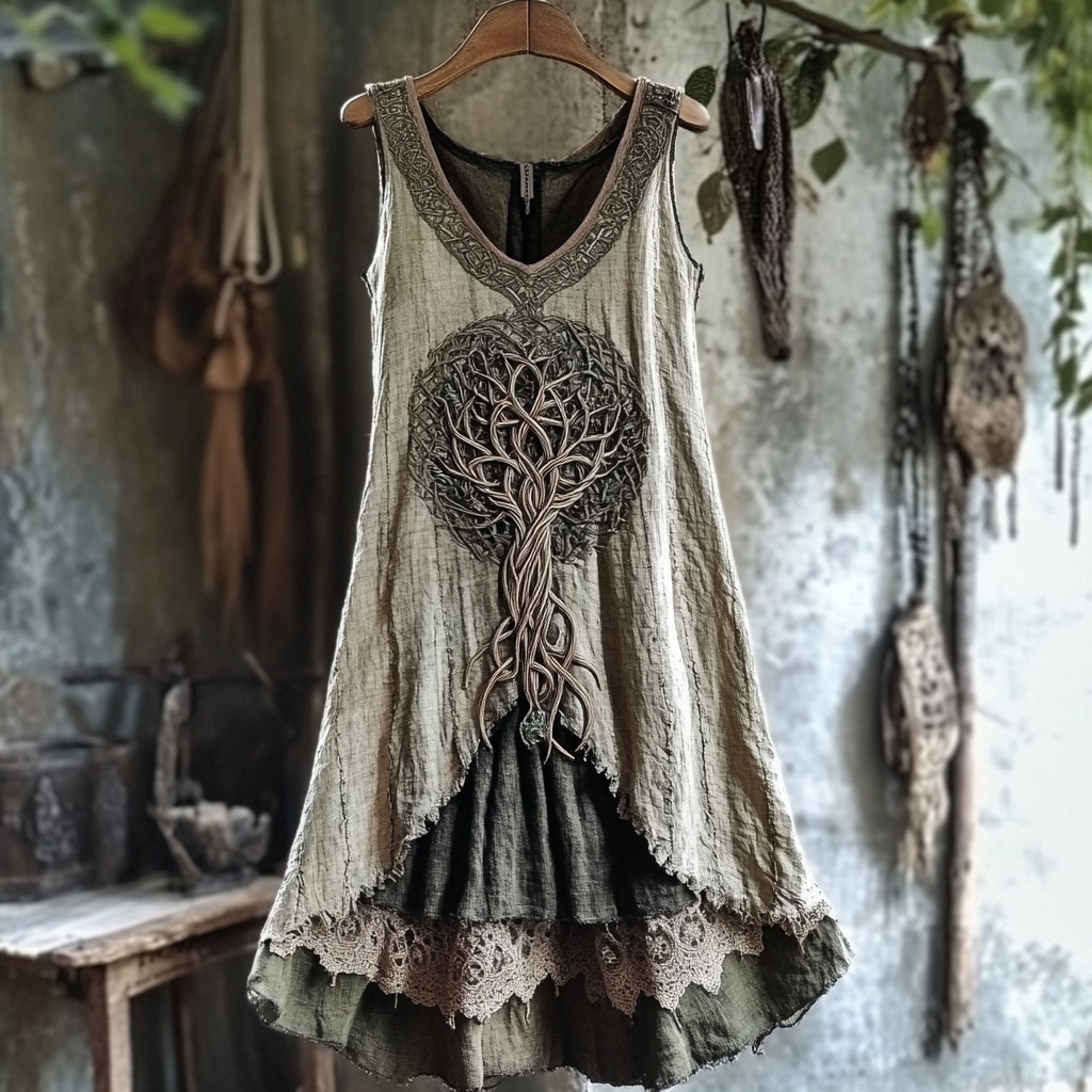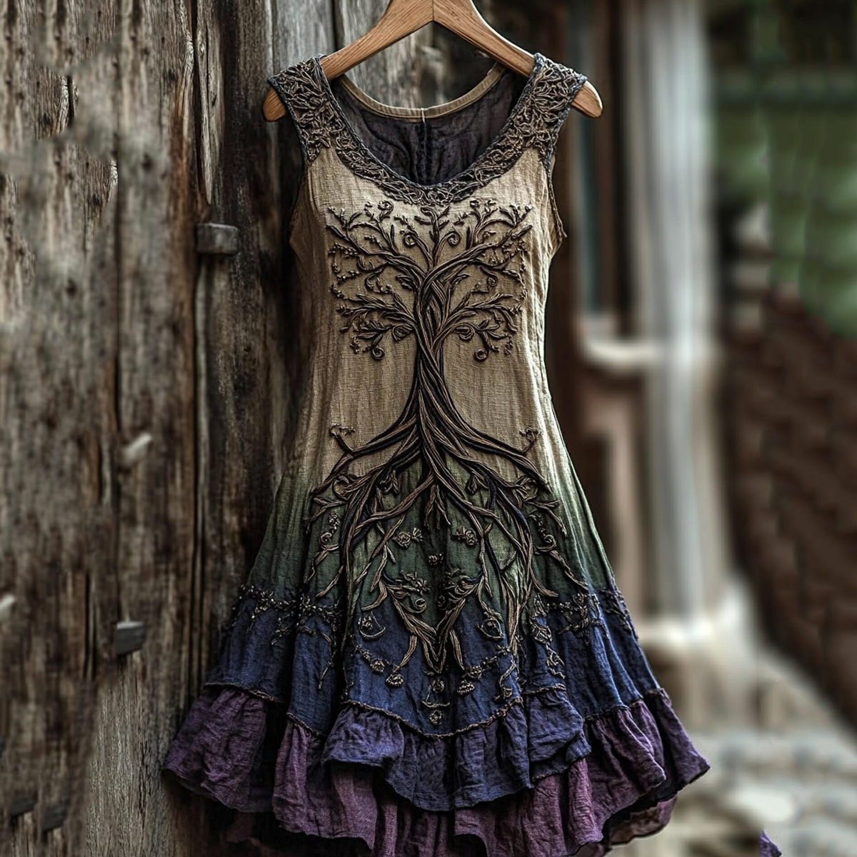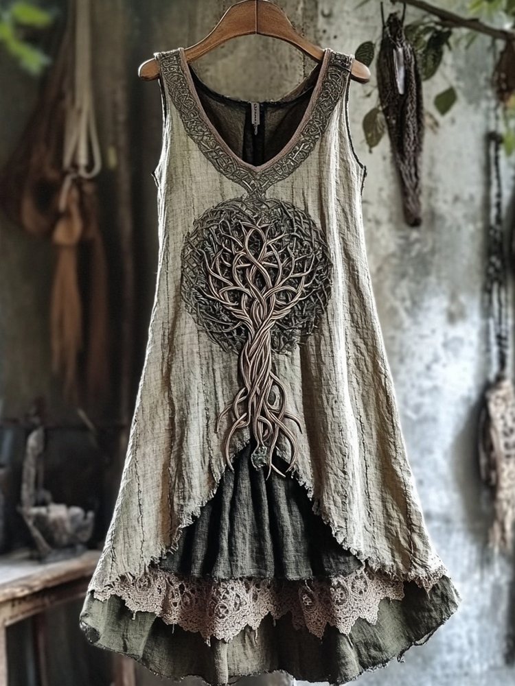 Tribal Tree Of Life Lace Patchwork Art Linen Tank Dress