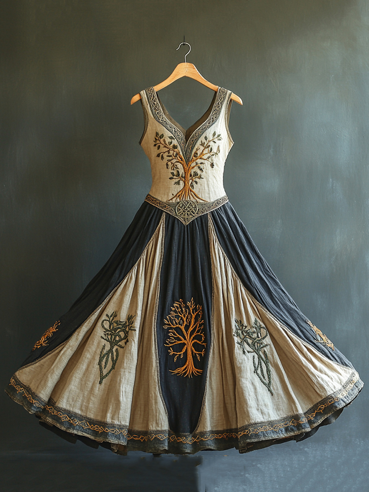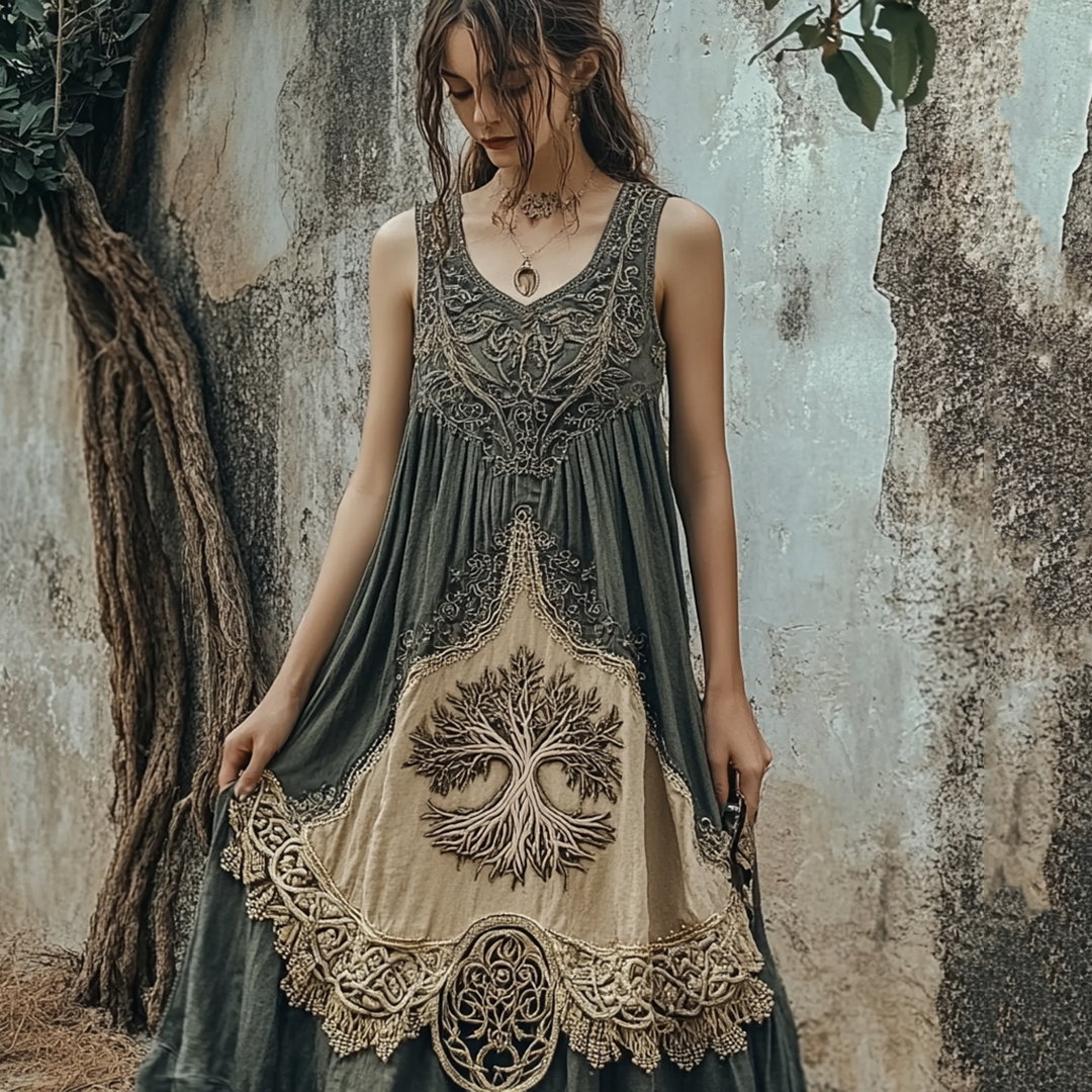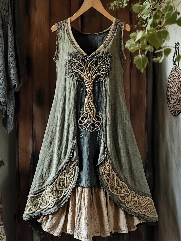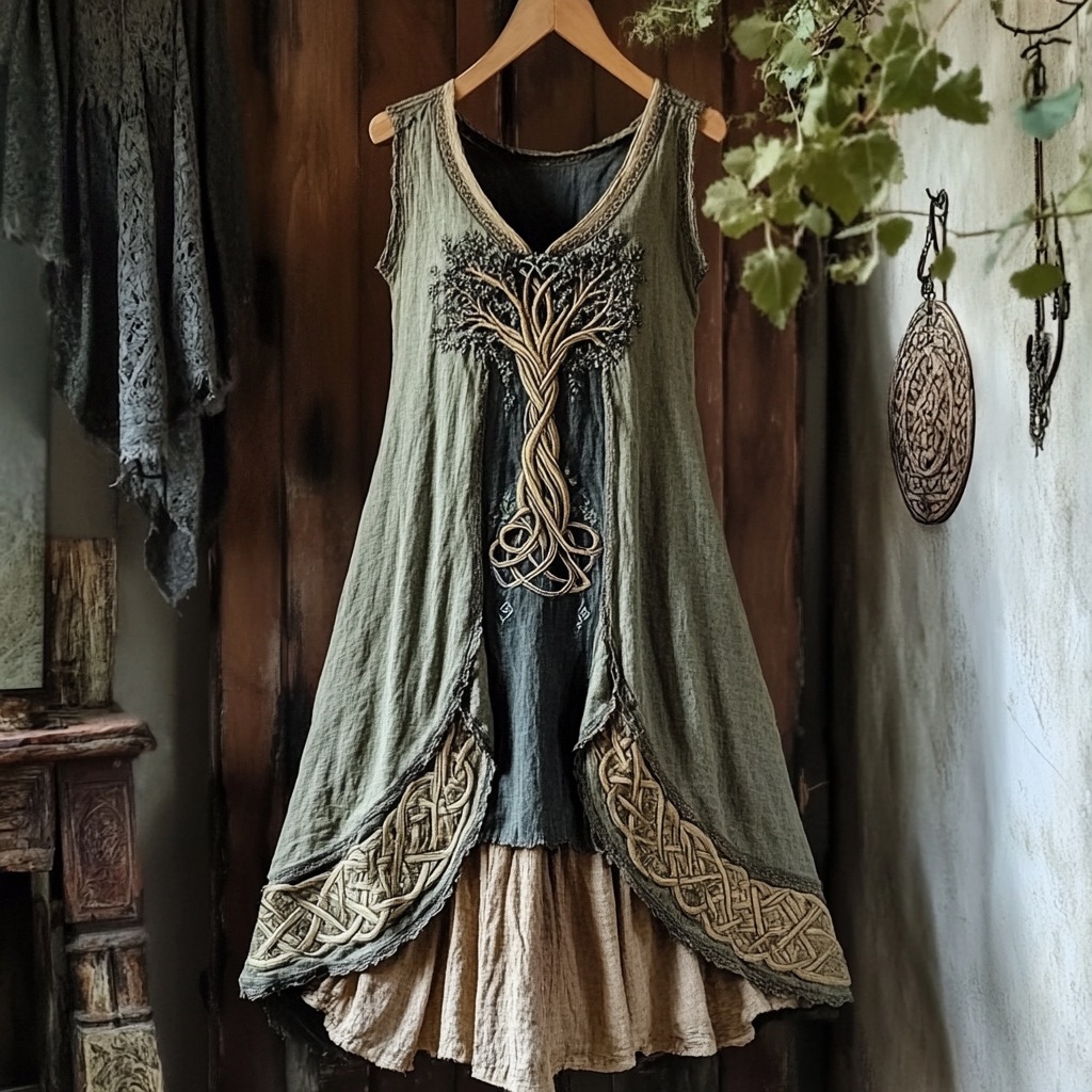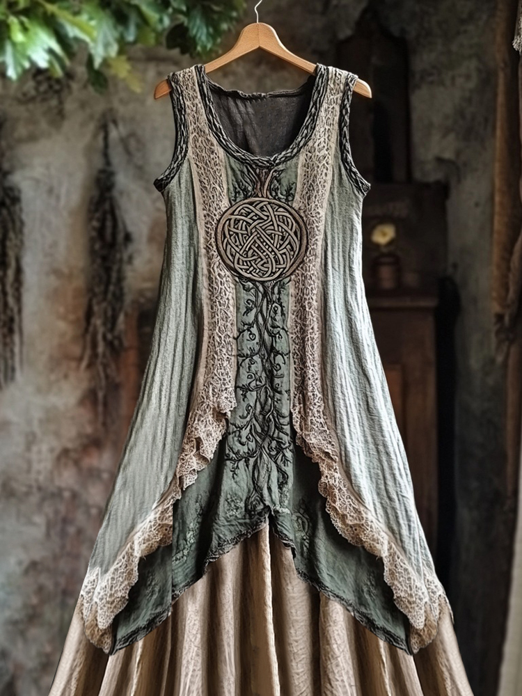Tribal Celtic Knot Plant Embroidery Lace Patchwork Art Linen Tank Dress