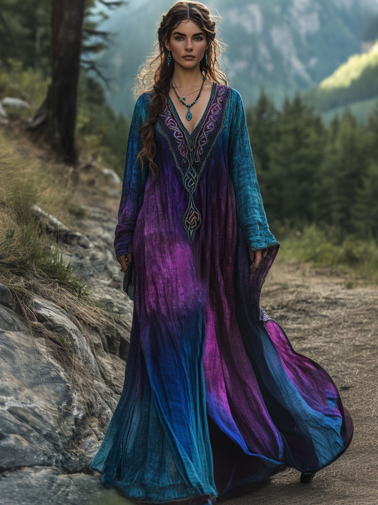 Vintage Viking Tribal Celtic Knot Gradient Linen V-neck Long Kaftan