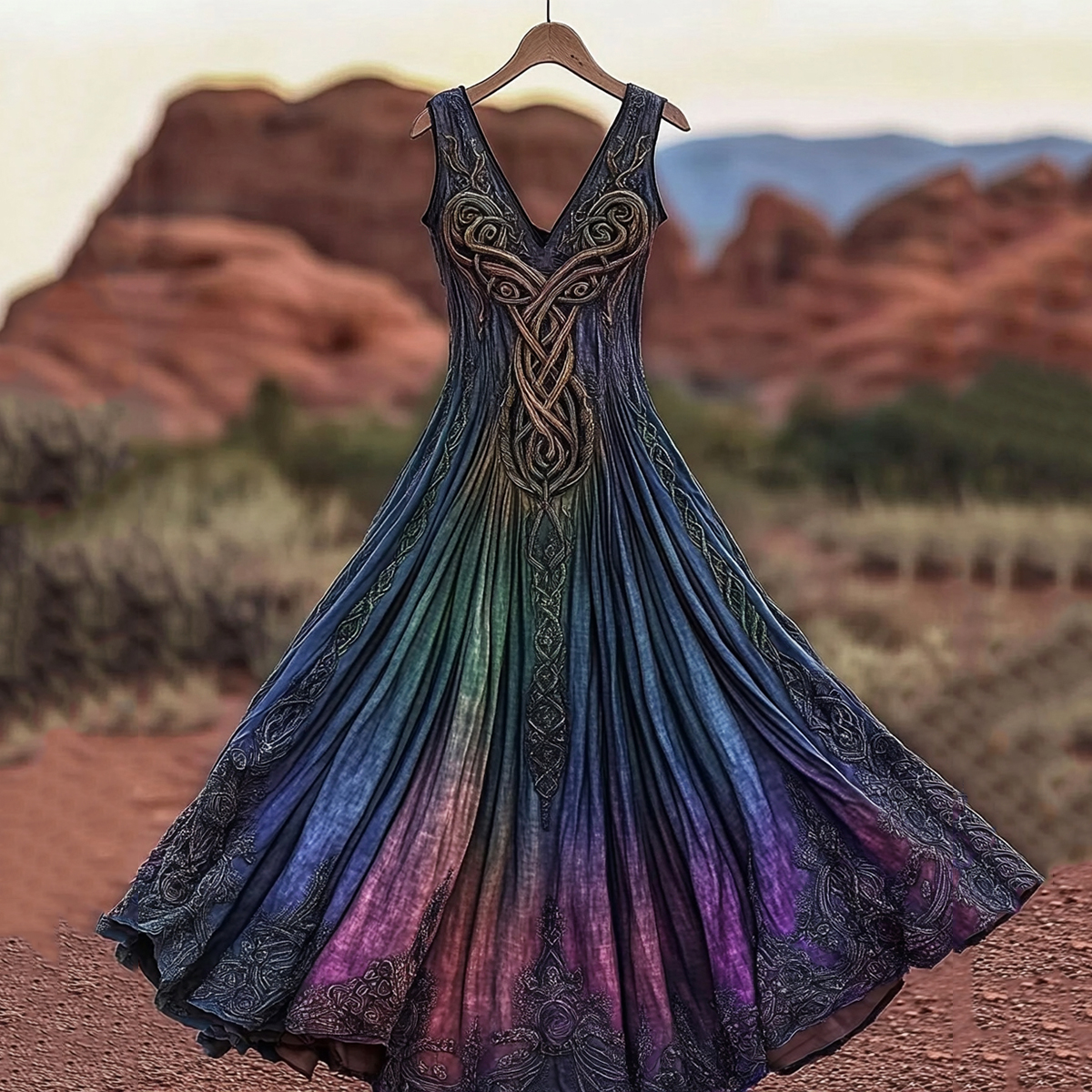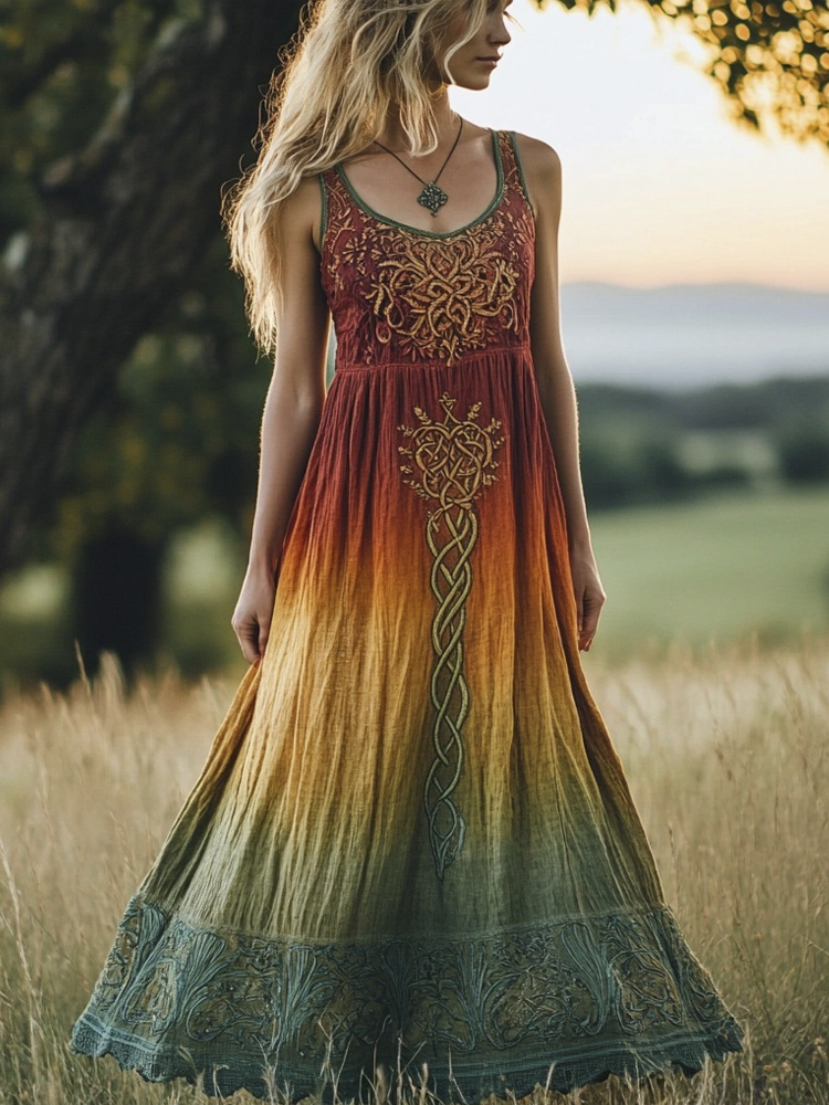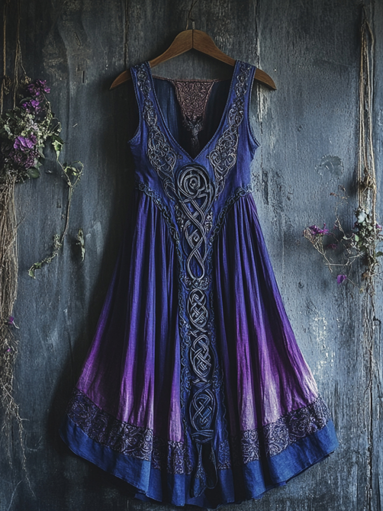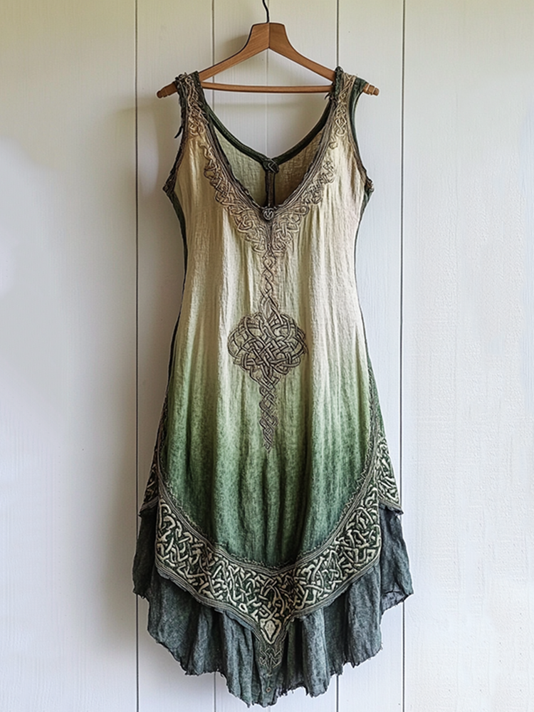 Vintage Viking Tribal Celtic Knot Embroidery Gradient Art Linen Tank Dress