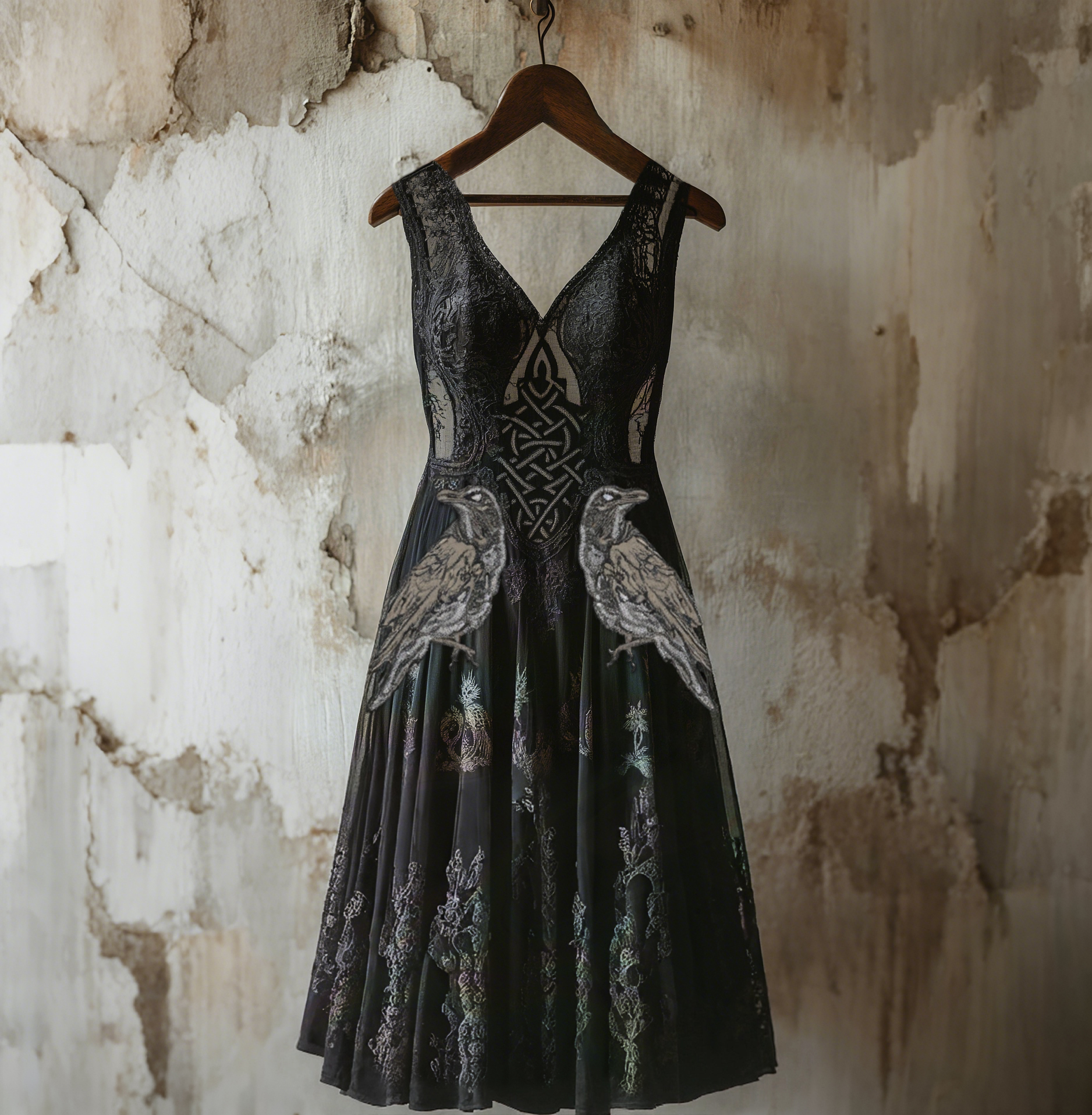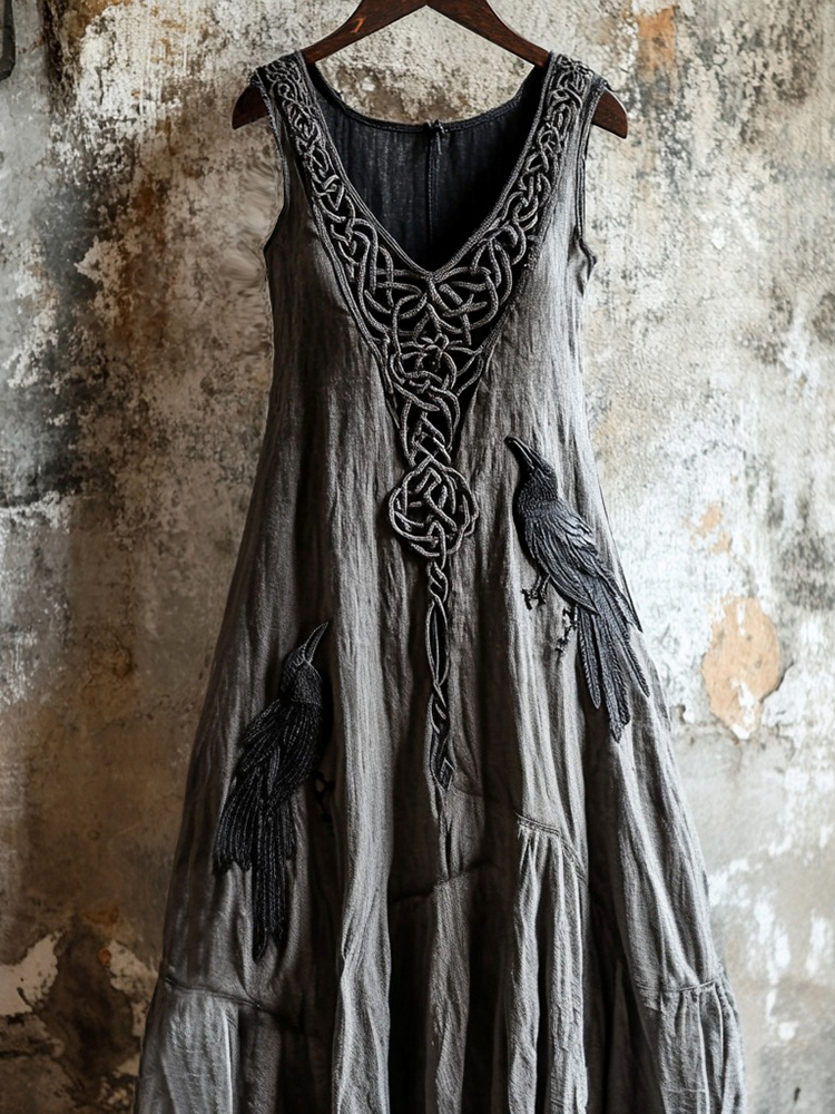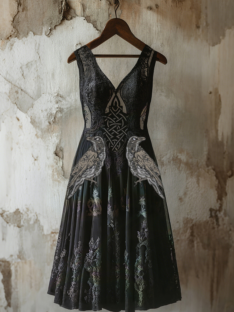 Women's Tribal Raven Embroidery Celtic Lace Art Tank Dress