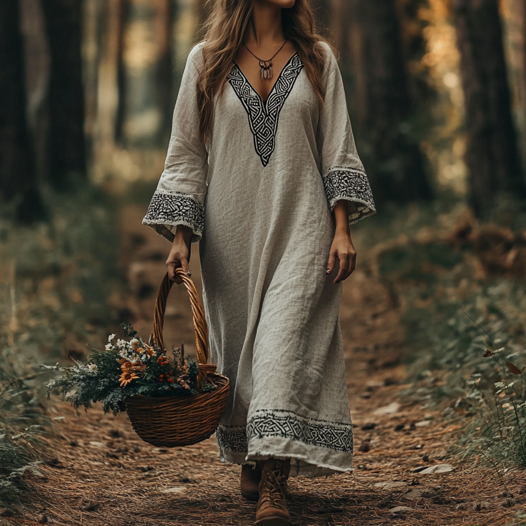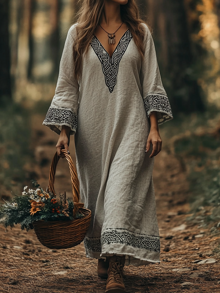 Vintage Vintage Viking Tribal Celtic Knot Art Linen V-neck Maxi Dress