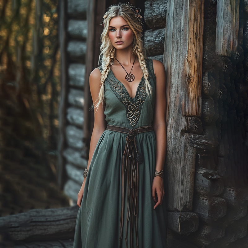 Vintage Viking Celtic Knot Plant Embroidery Design Linen Suspender Maxi Dress