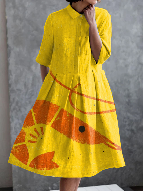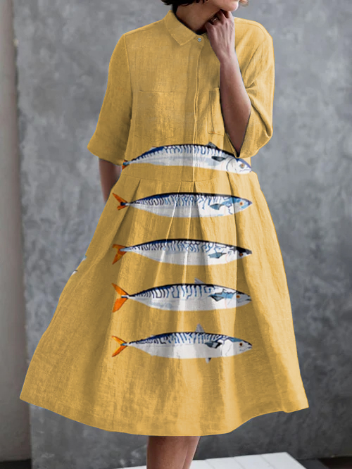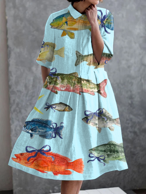 Vintage Fish Art Print Casual Pocket Half Sleeve Dress