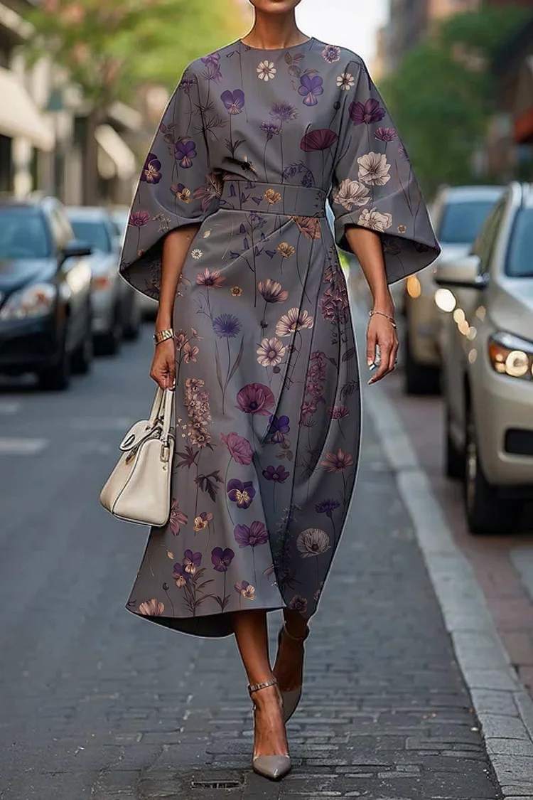 Women's Elegant Floral Art Print Midi Dress