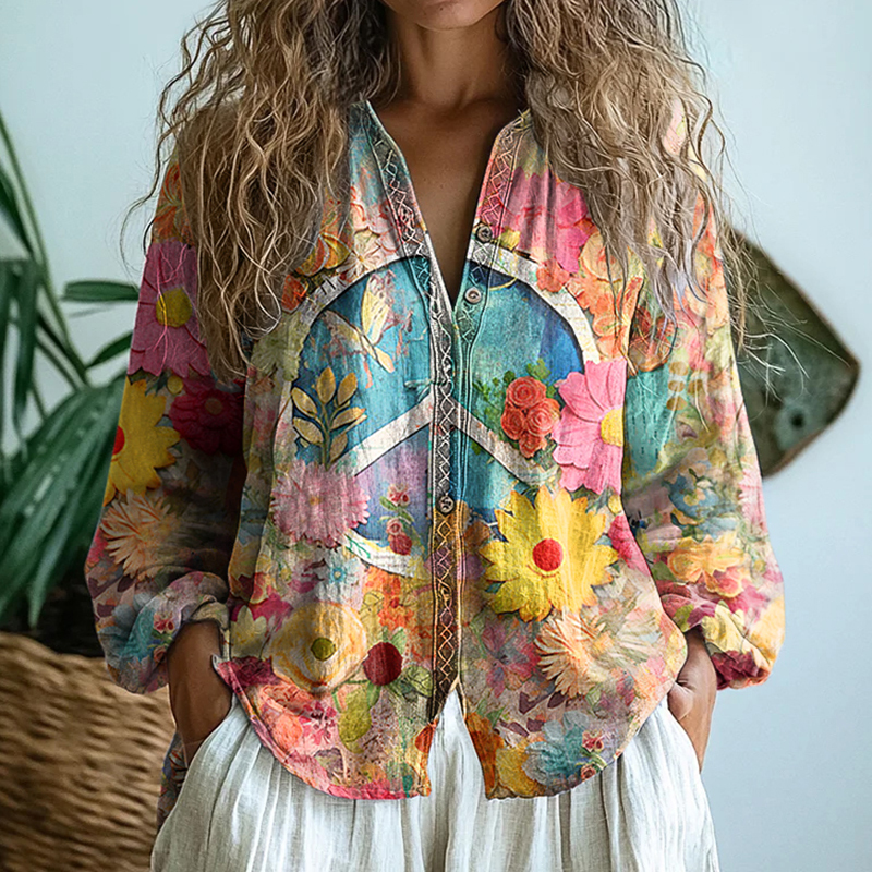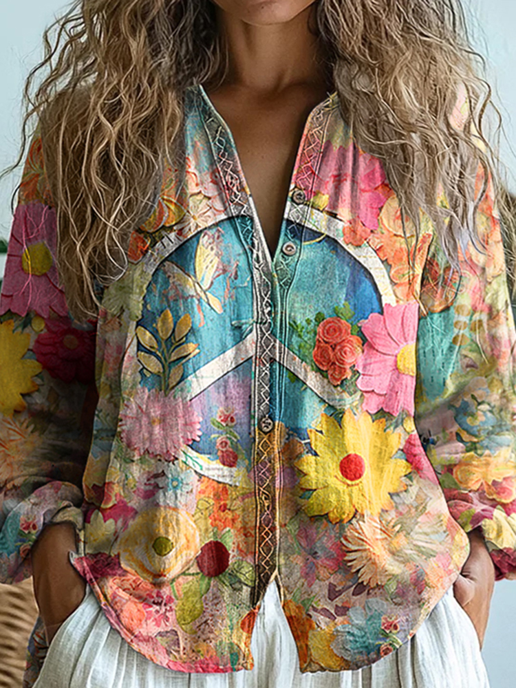 Vintage Hippie Vibe Peace And Love Hippie Floral Painting Art Linen Print Long Sleeve Shirt