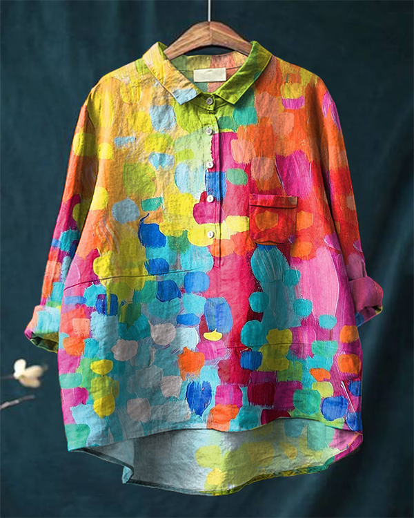 Retro Color Block Print Casual Cotton and Linen Shirt