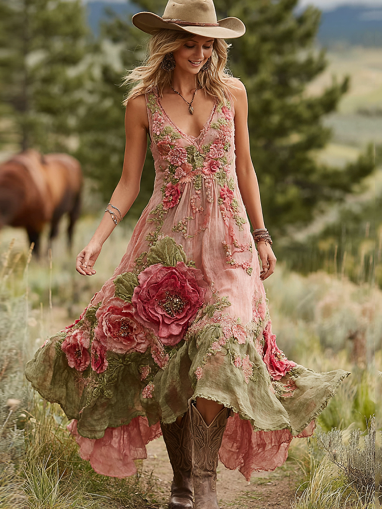 Vintage Rose Floral Embroidered Sleeveless Maxi Dress