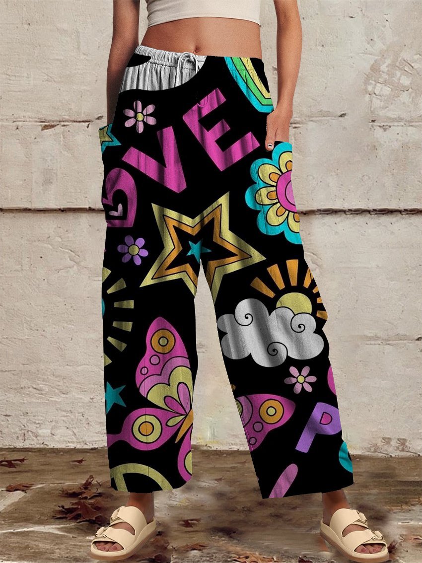 Women‘s Casual 1980s Hippie Print Wide Harem Leg Pants