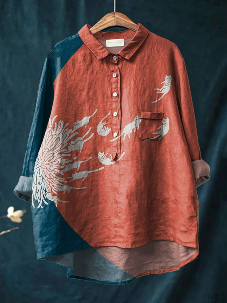 Women's Abstract Creative Dandelion and Cat Art Print Casual Cotton And Linen Shirt