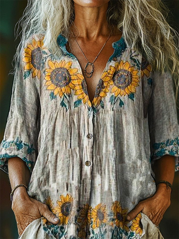 Women's Vintage Floral Pattern Art Print Casual Cotton Linen Shirt