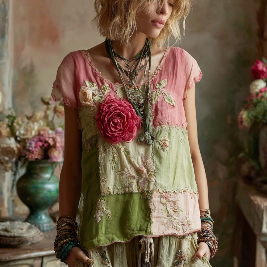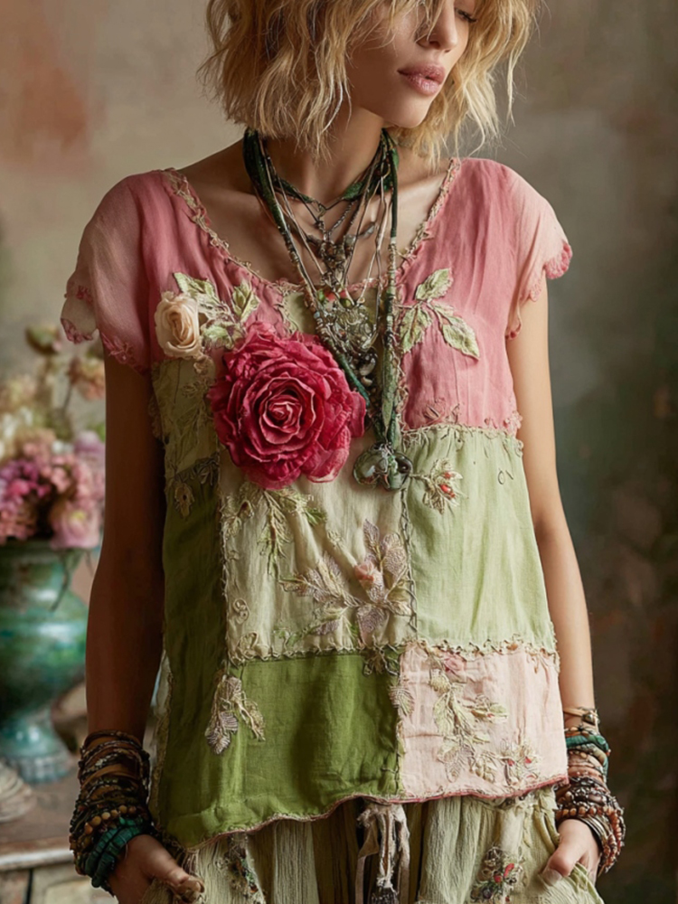Women's Vintage Floral Pattern Crew Neck T-shirt