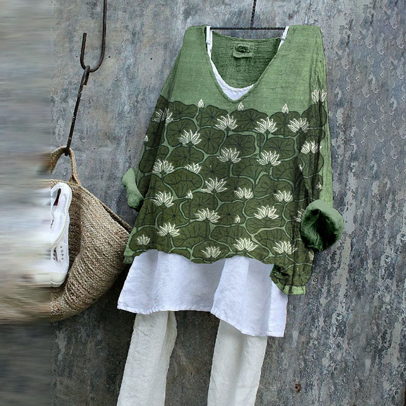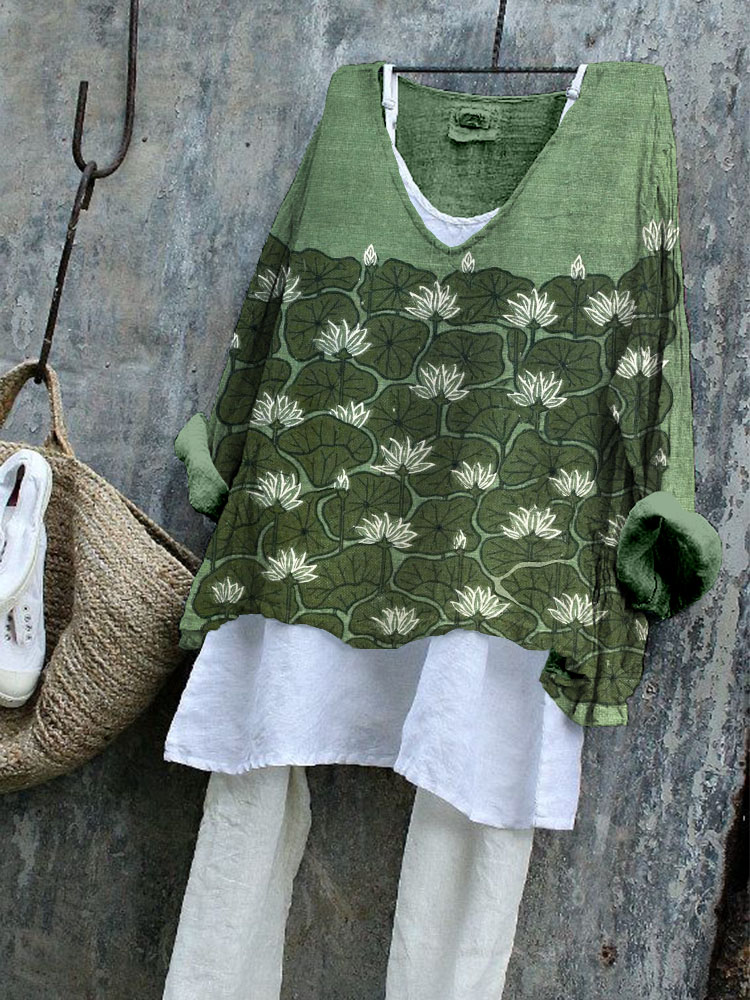 Vintage Lotus Flowers Art Linen Blend Cozy Tunic