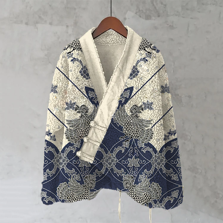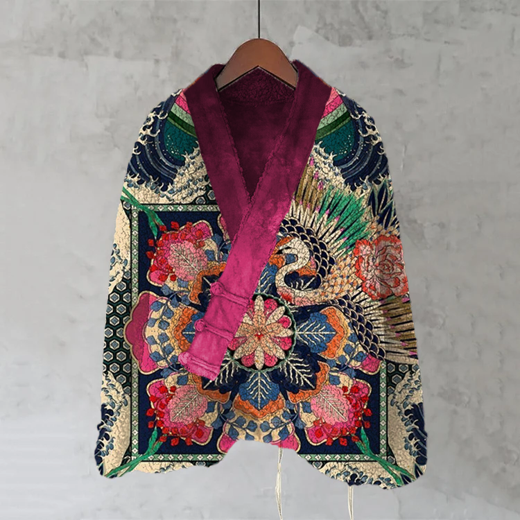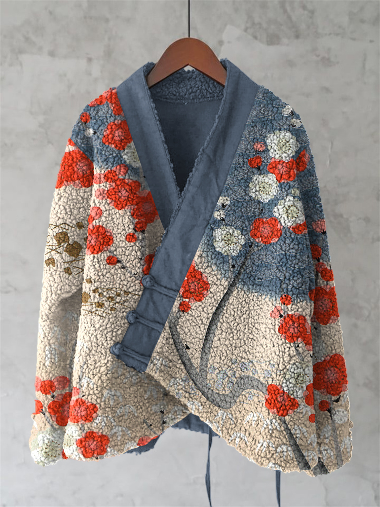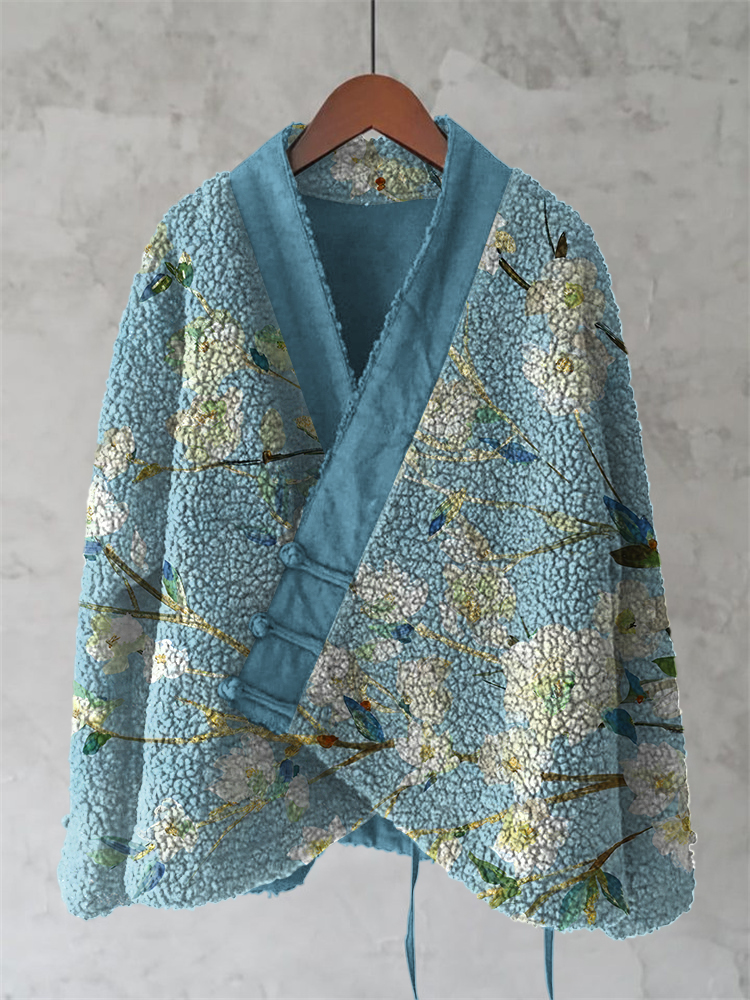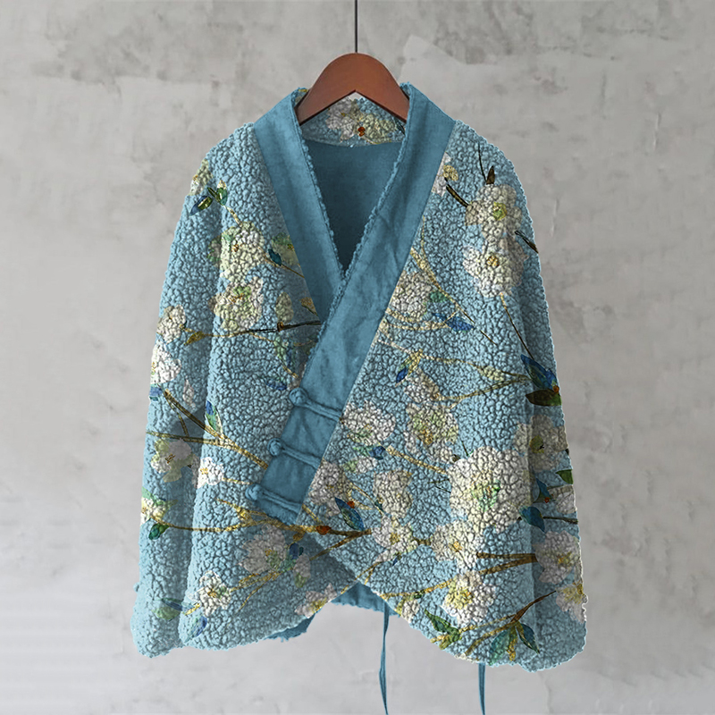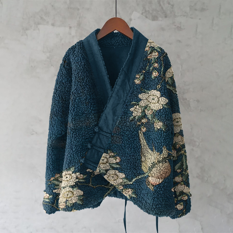 Vintage Japanese Flower And Bird Art Cozy Fleece Kimono Cardigan