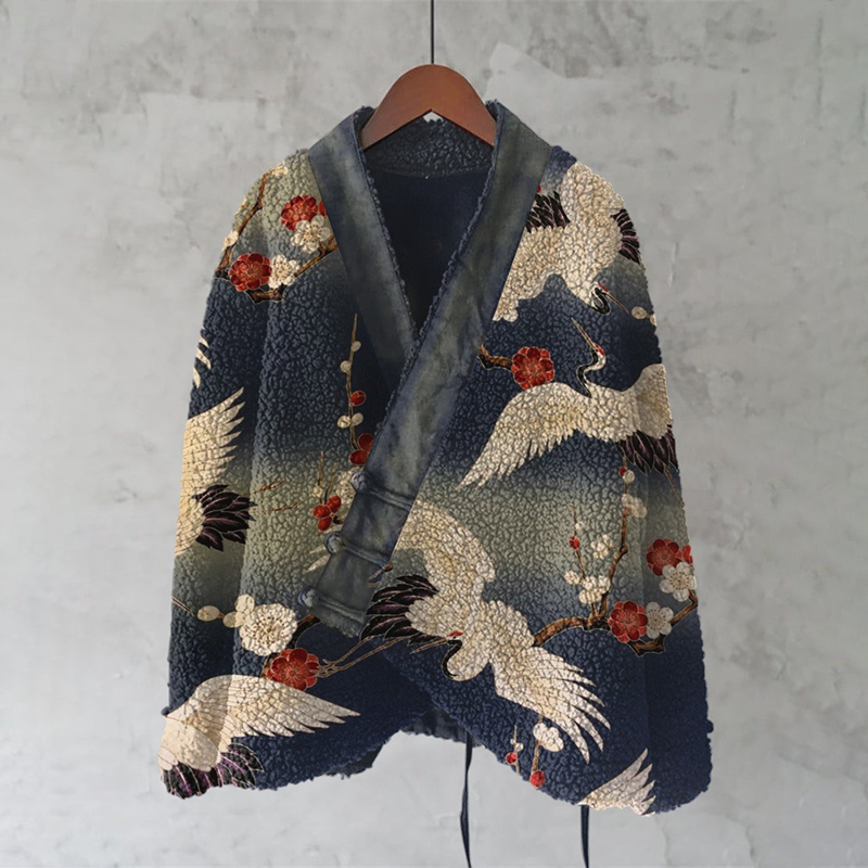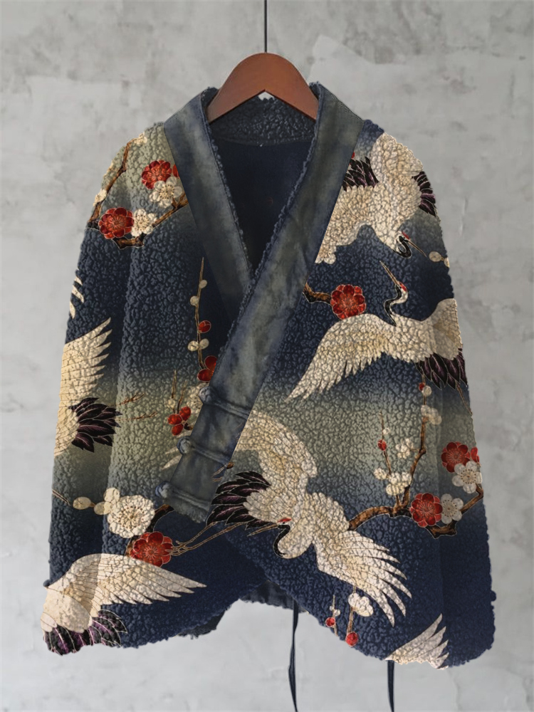 Cranes & Pine Trees Japanese Pattern Cozy Fleece Kimono Cardigan
