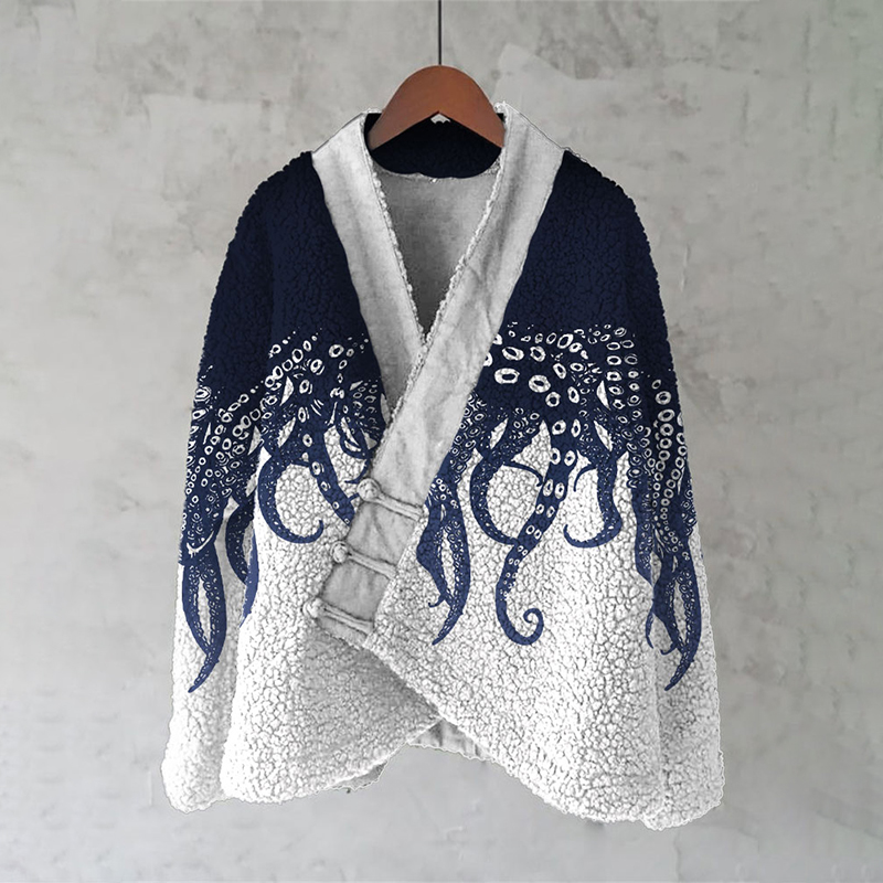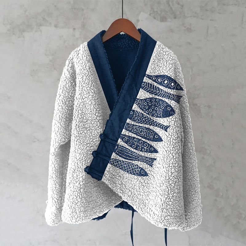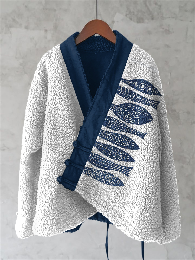 Japanese Fish Lino Art Cozy Fleece Kimono Cardigan
