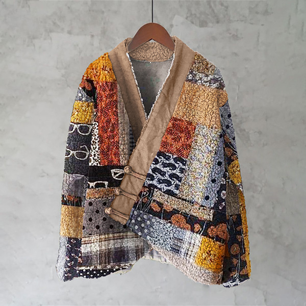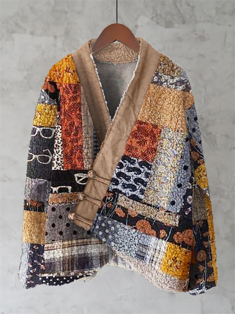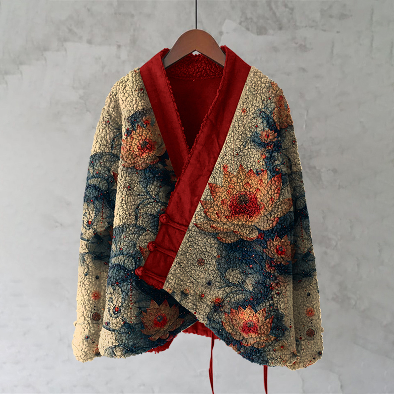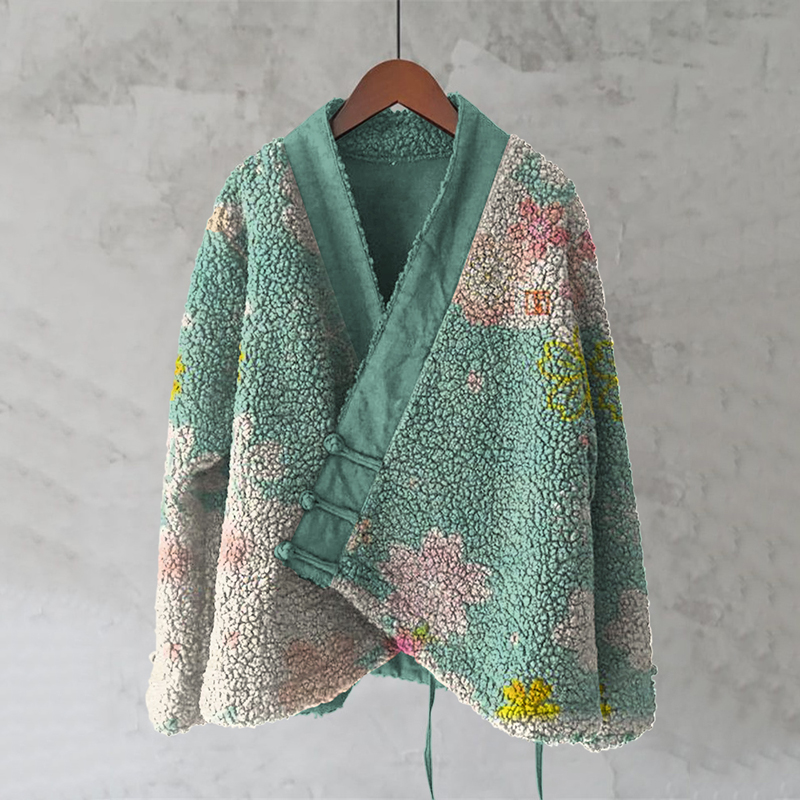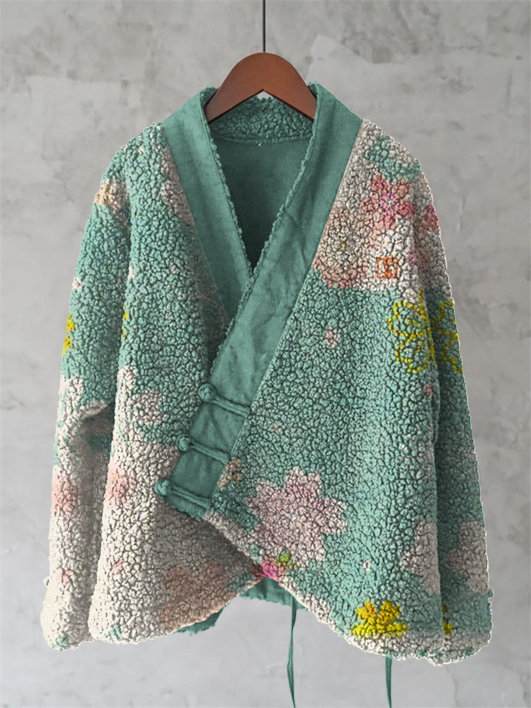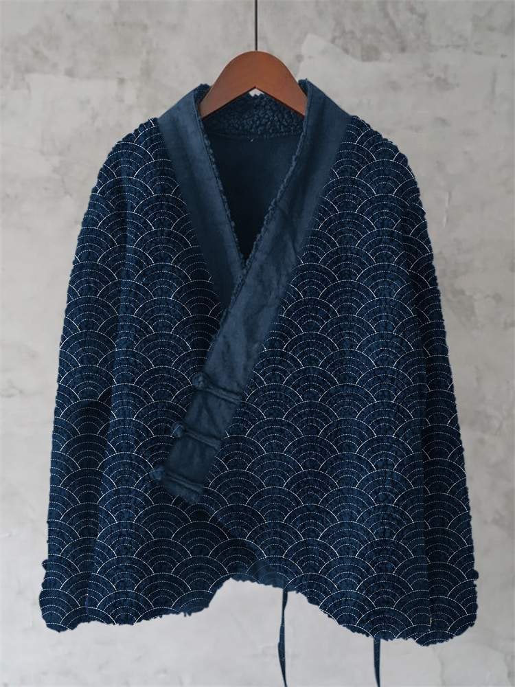 Japanese Embroidered Sashiko Art Cozy Fleece Kimono Cardigan