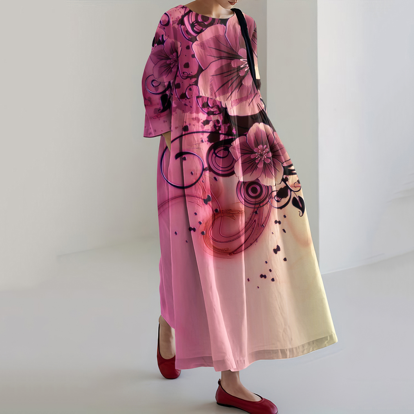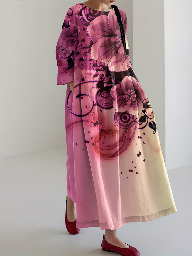 Japanese Art Flower Print Loose Casual Midi Dress