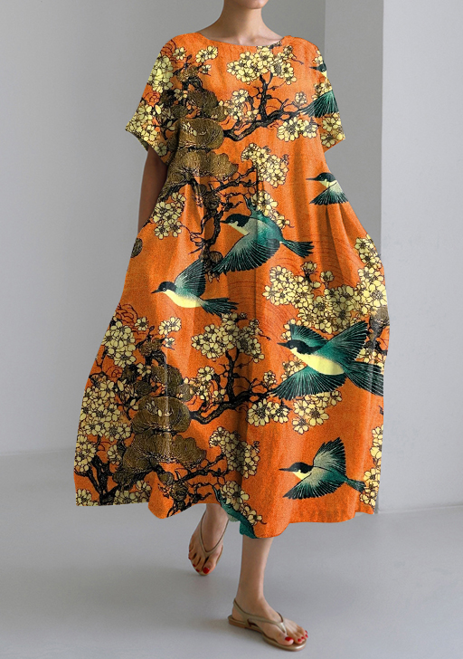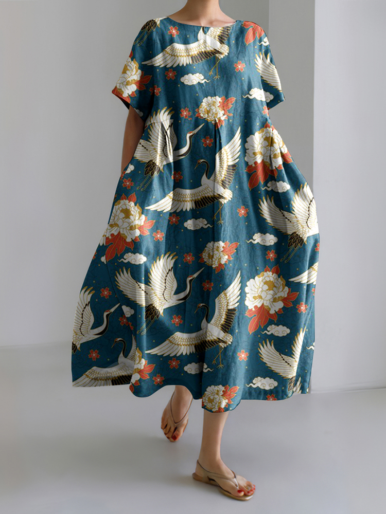 Japanese Art Floral Crane Printed Loose Midi Dress