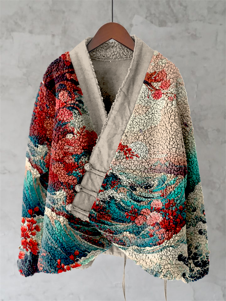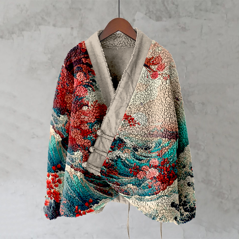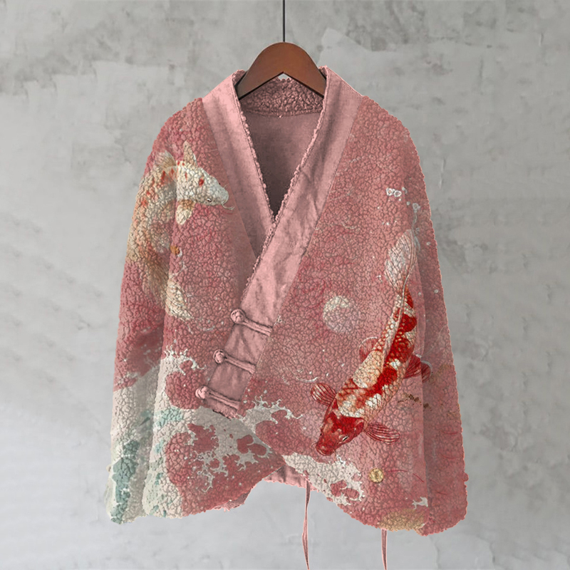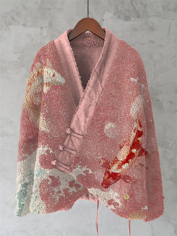 Retro Koi Japanese Waves Art Cozy Fleece Kimono Cardigan