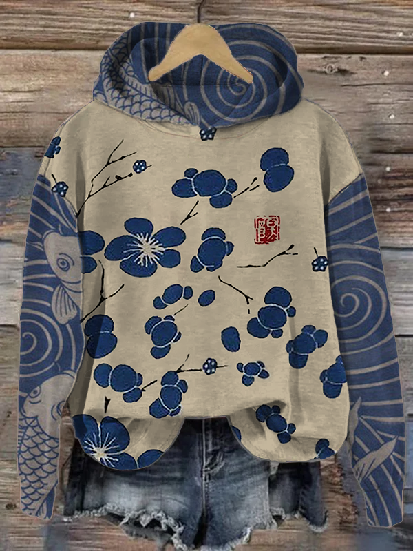 Women'S Leisure Japanese Sakura Art Painting Print Long Sleeve Hooded Sweater