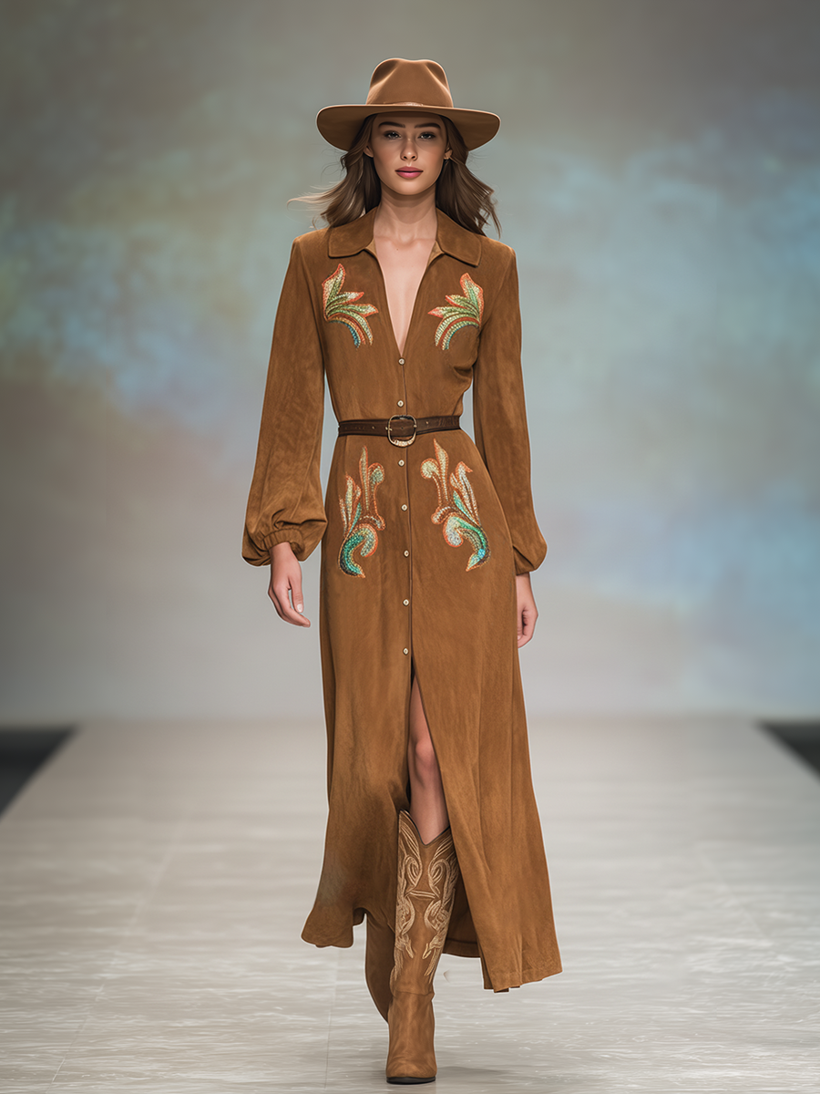 Retro Western Style Embroidered Faux Suede Maxi Dress