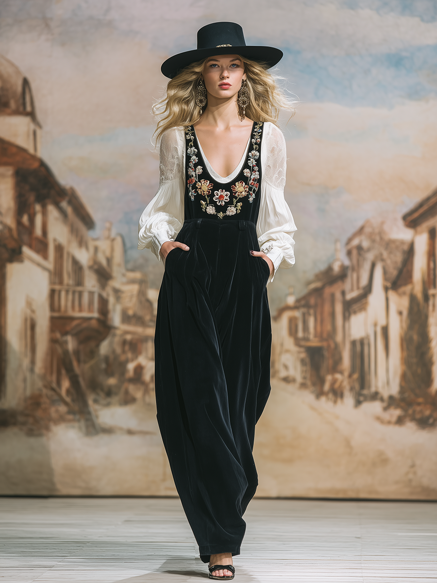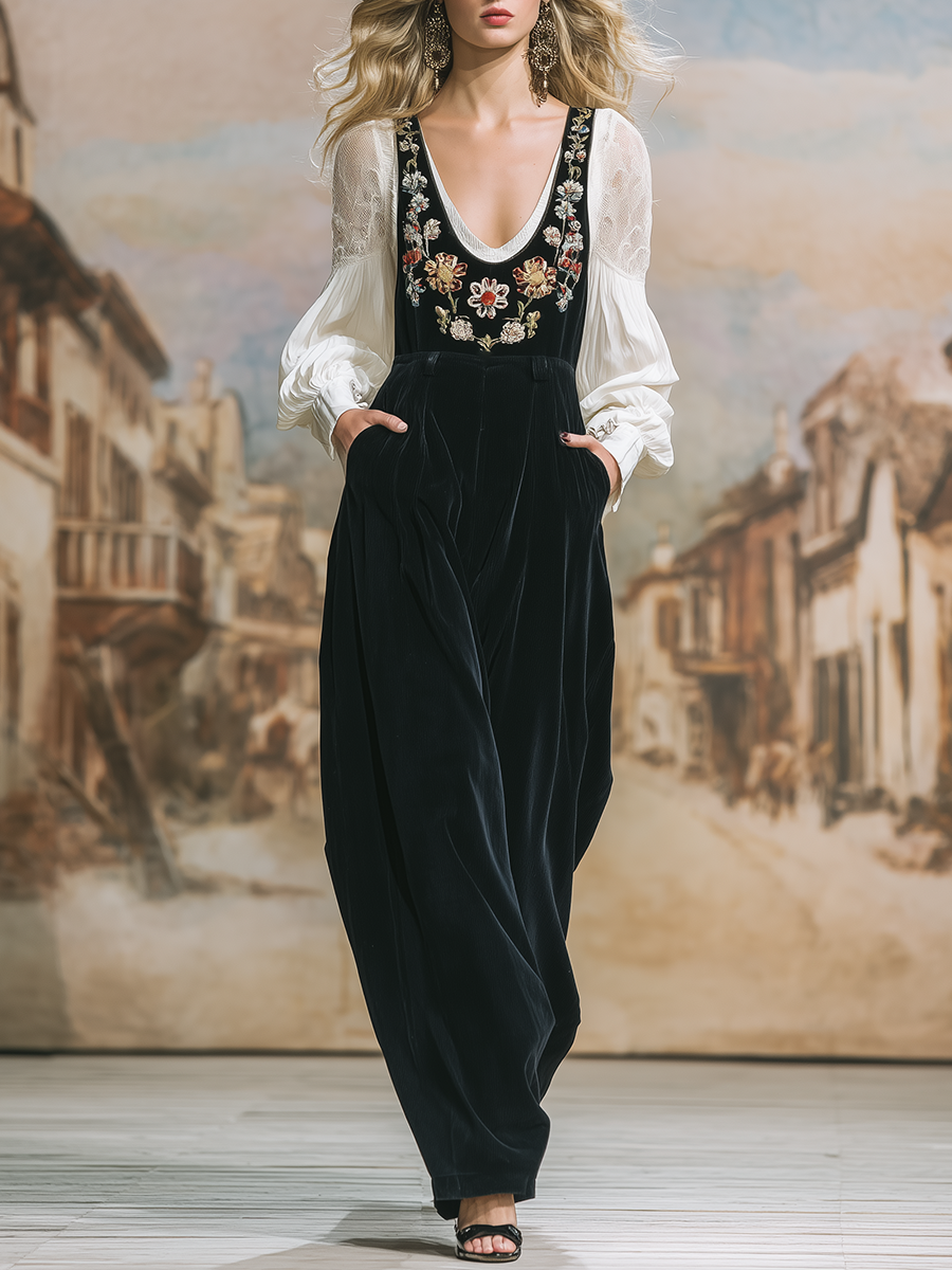 Retro Bohemian Floral Embroidered Black Corduroy Overalls