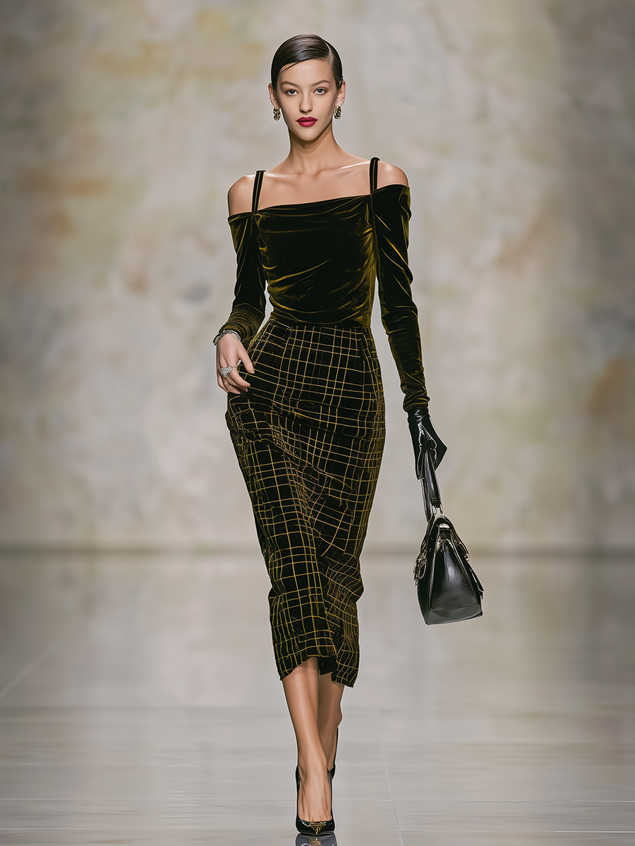 Elegant Retro Plaid Print Velvet Midi Dress