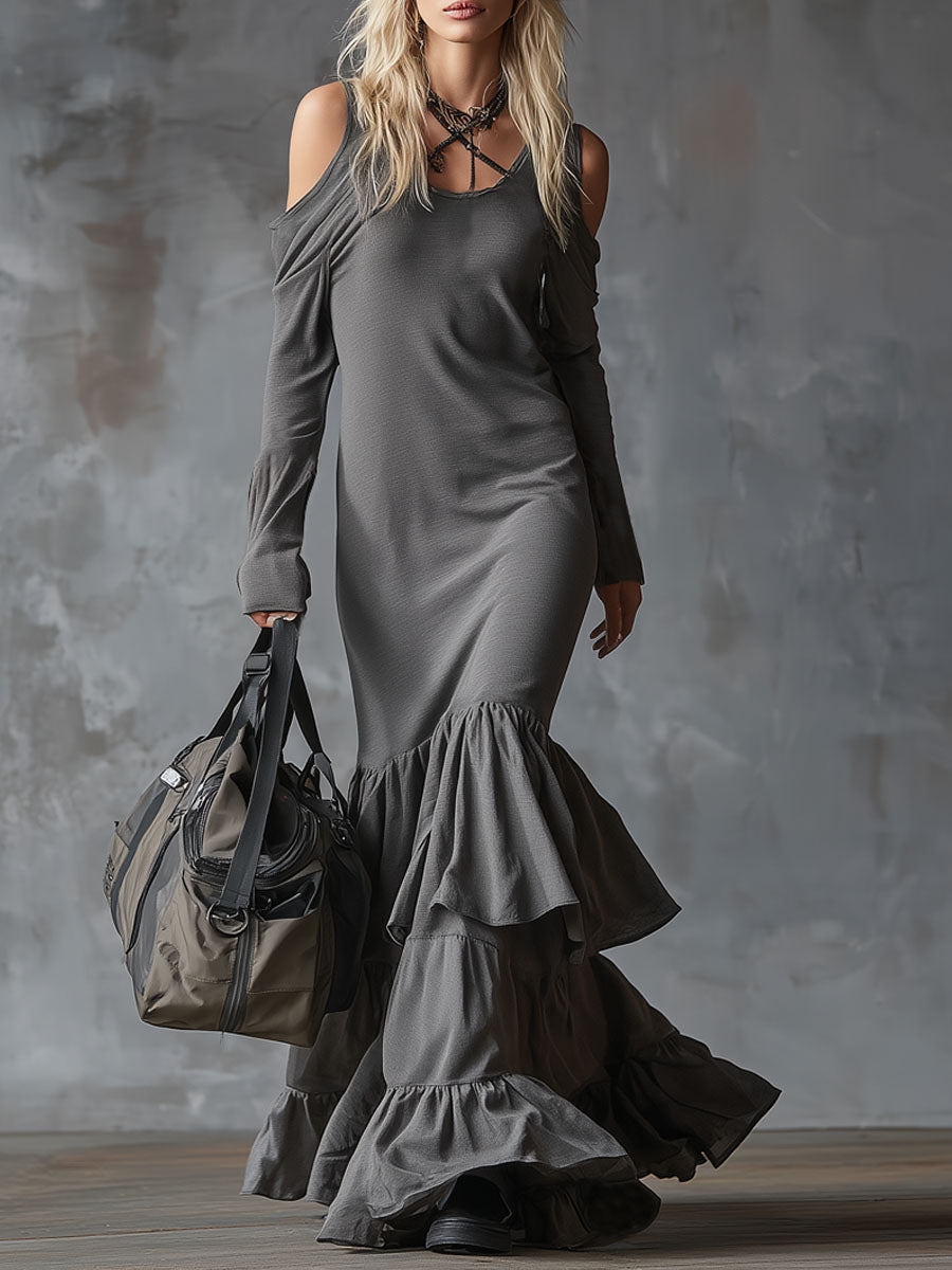 Grey Round Neck Off-shoulder Ruffle Maxi Dress