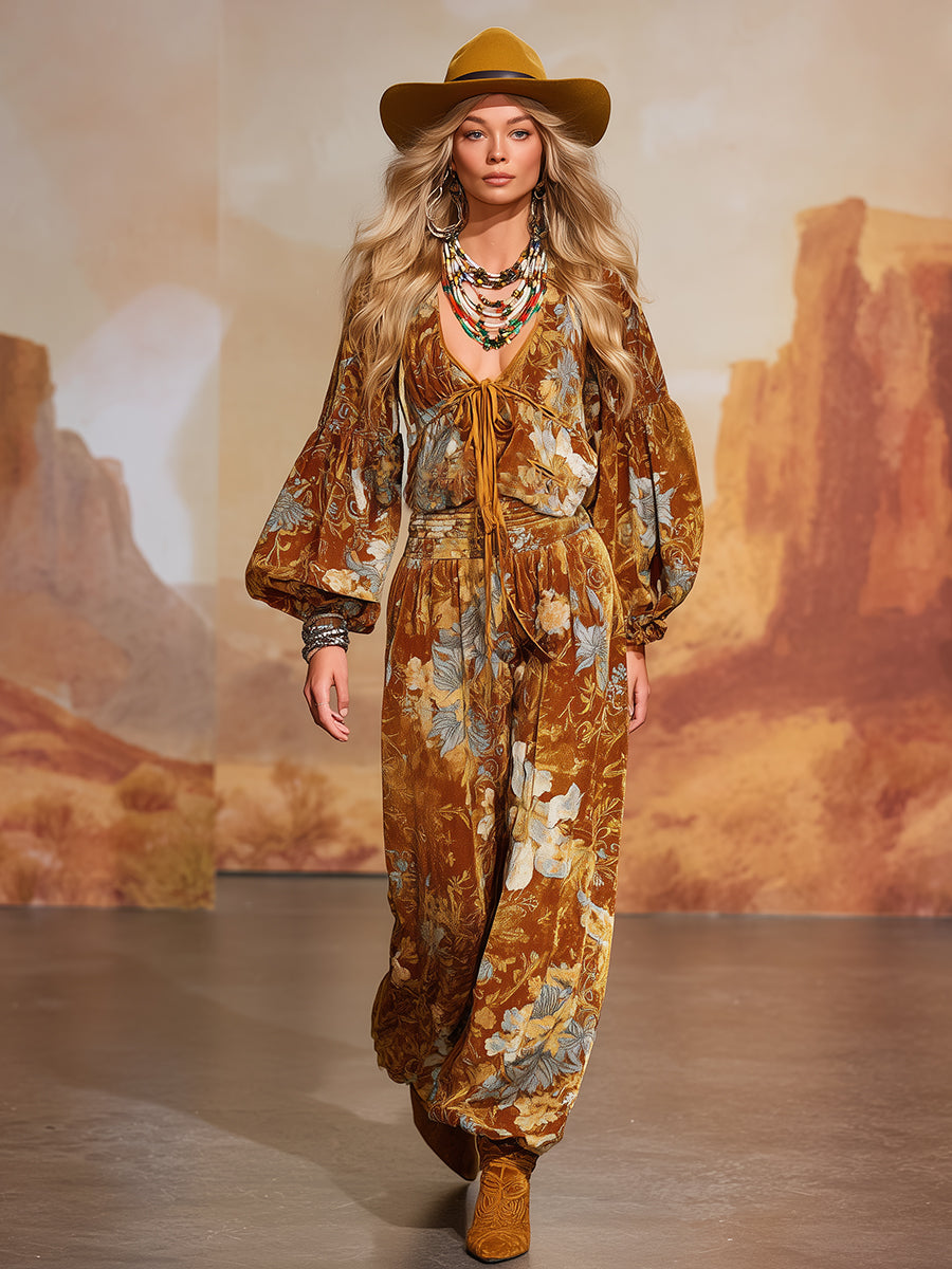 Retro Bohemian Print U-Neck Top And Lantern Pants Velvet Set