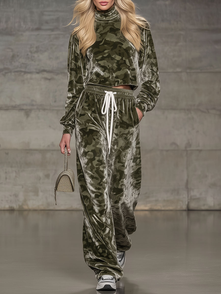 Loose-fitting Velvet Camouflage Print Turtleneck T-shirt And Casual Pants Suit