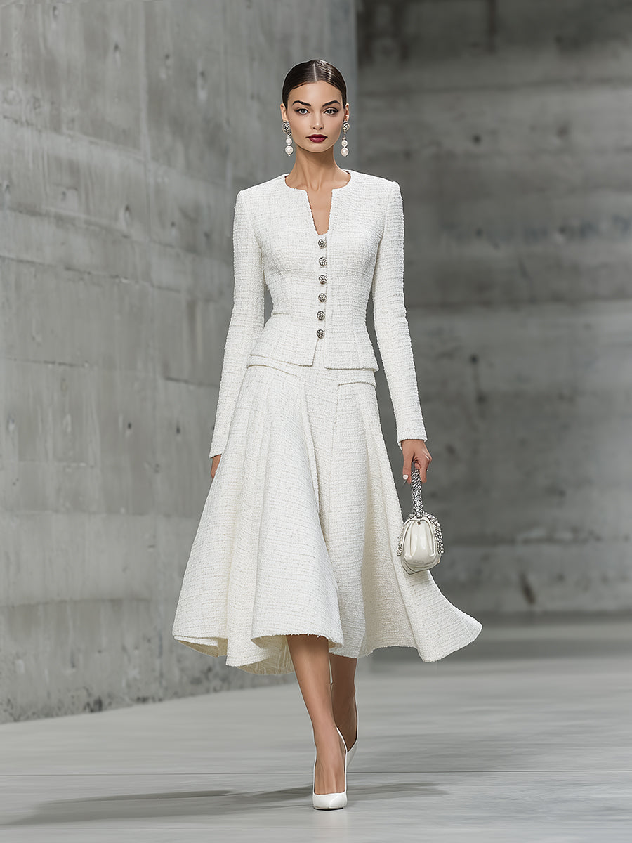 Elegant White Tweed Round Neck Button-down Jacket And Flared Skirt Set