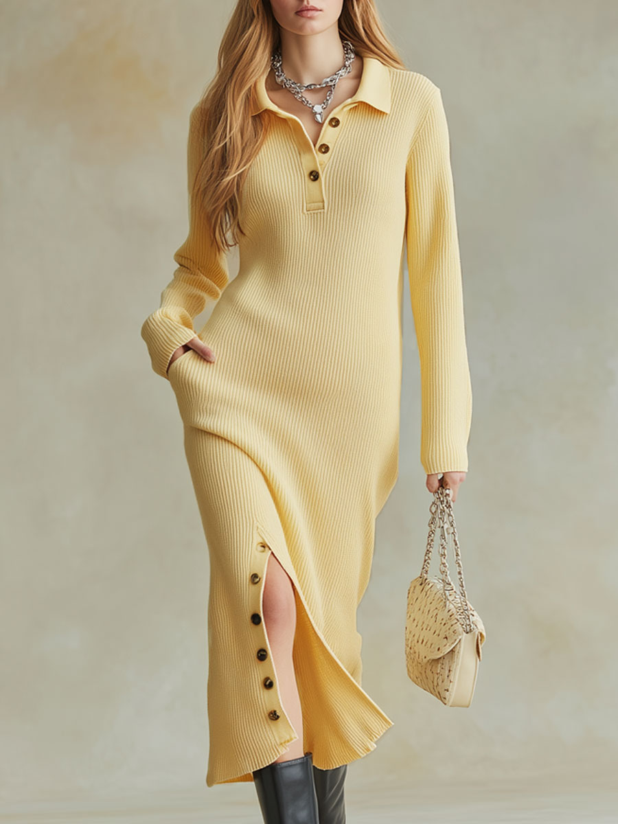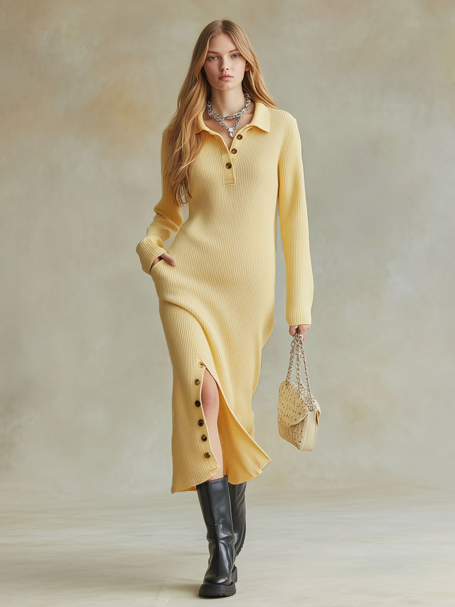 Retro Polo Yellow Knit Ribbed Slit Long-Sleeve Midi Dress