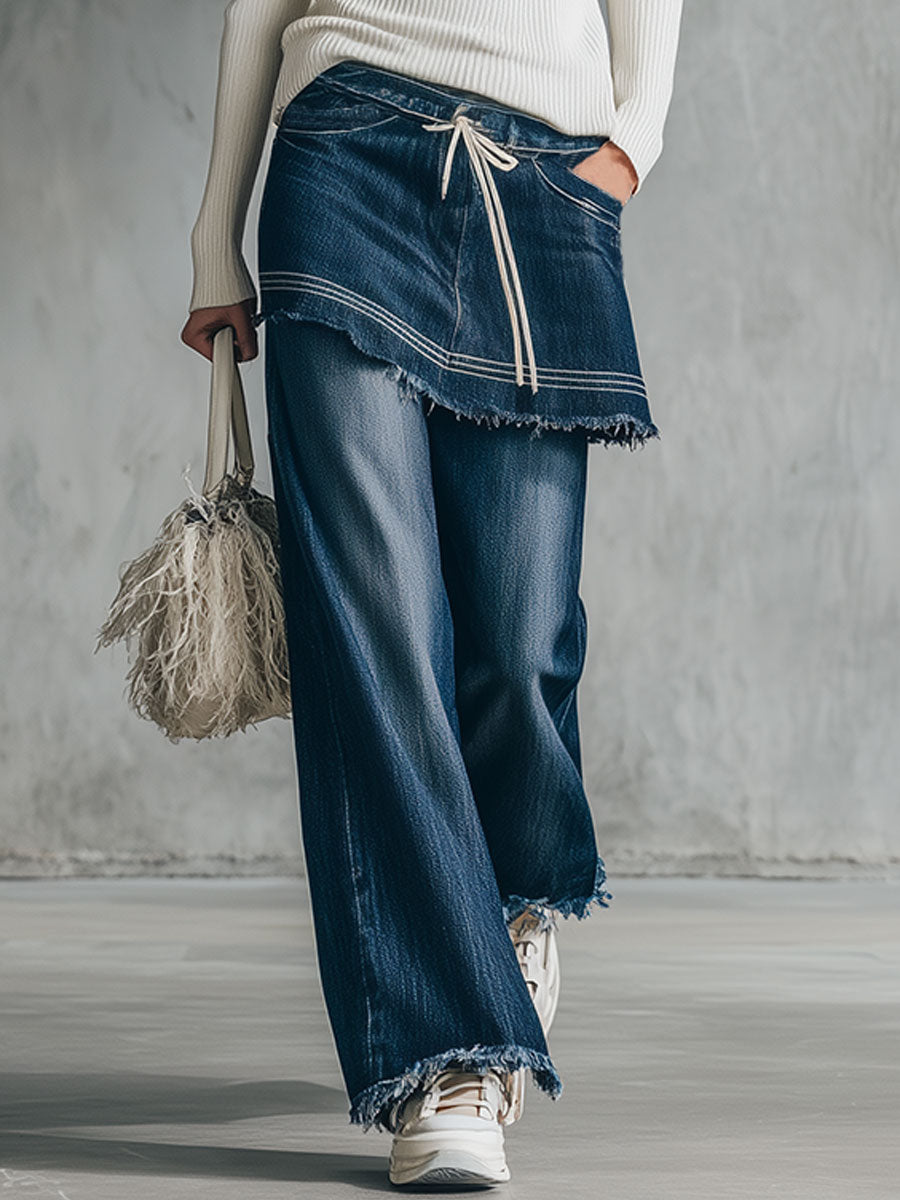 Fashionable Retro-style Two-piece Blue Mini Skirt And Wide-leg Jeans