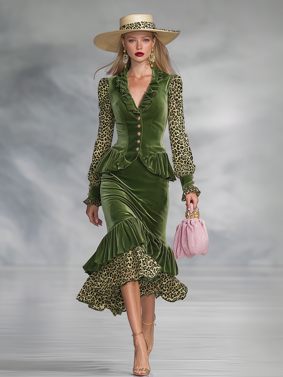 Retro-elegant V-neck Velvet Shirt And Ruffle Skirt Set