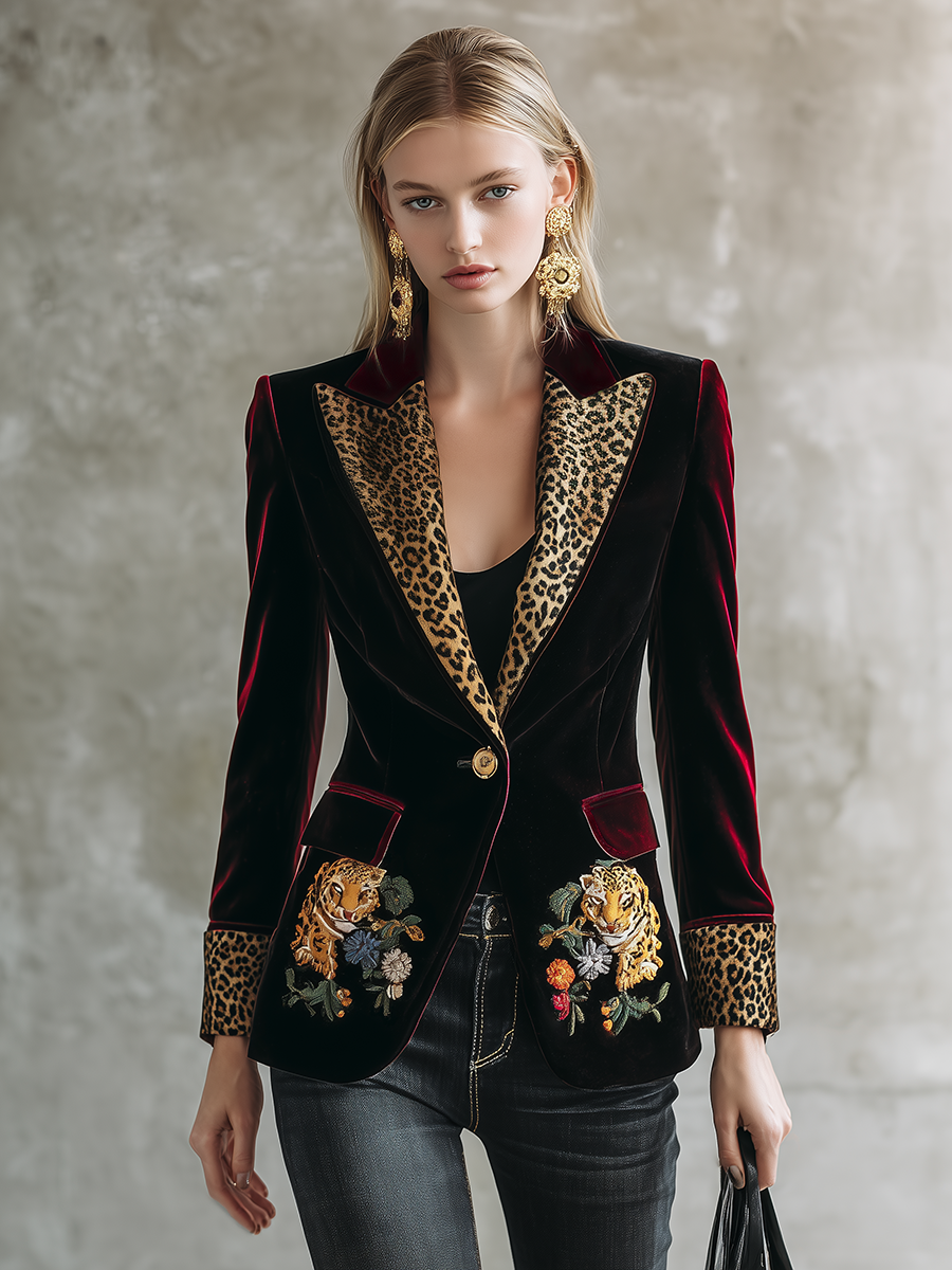 Retro Court Style Embroidered Leopard Print Lapel Velvet Blazer