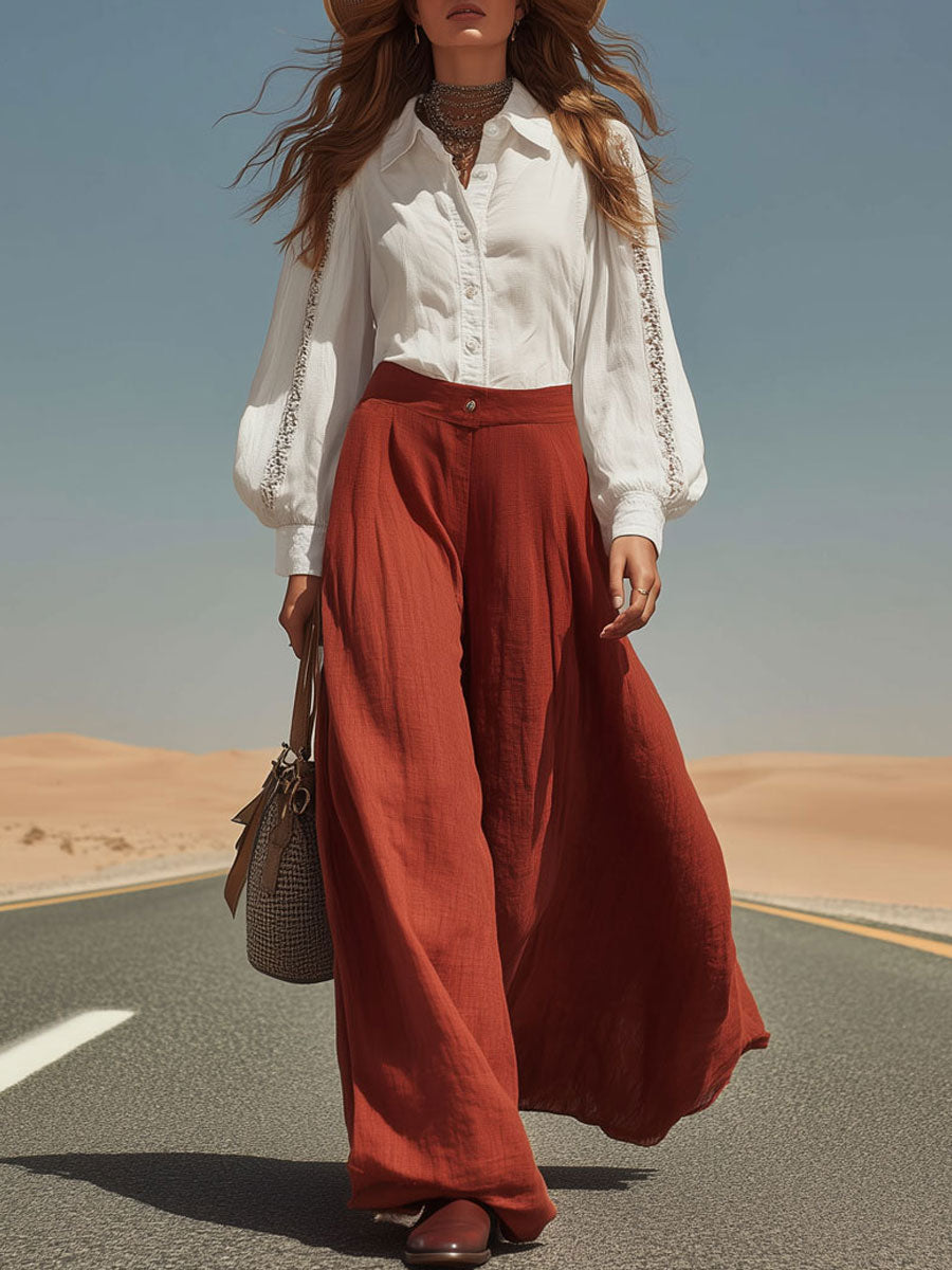 Retro Lace White Cotton Linen Long-Sleeved Shirt And Wide-Leg Pants Set