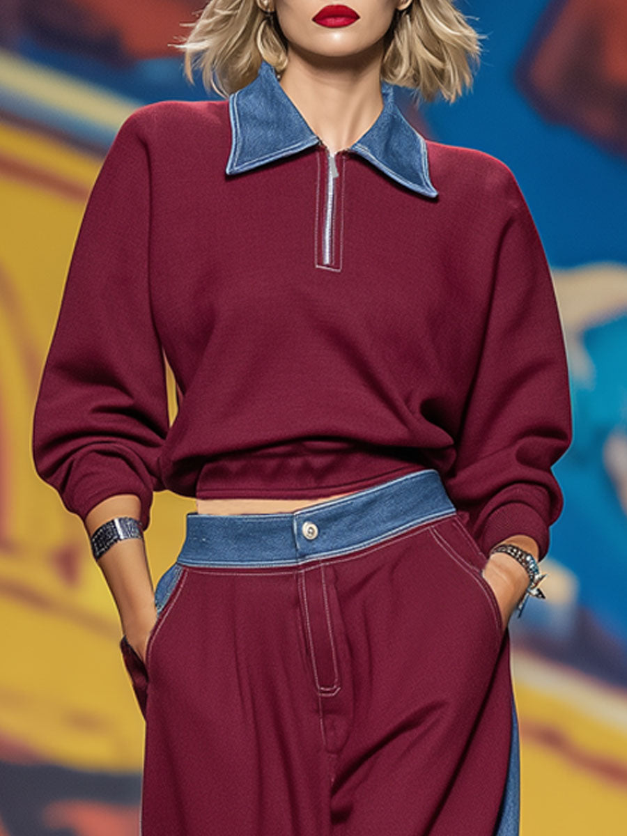 Loose-fitting Collared Zip-up Sweatshirt And Pants Set