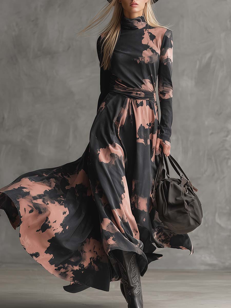Elegant Retro Western Stand-up Collar Pink And Black Tie-dye Print Maxi Dress