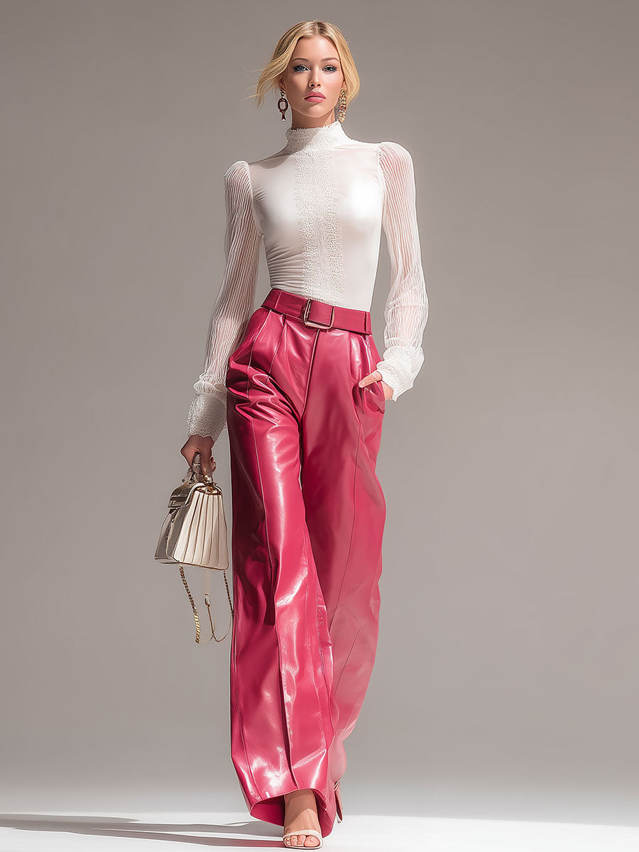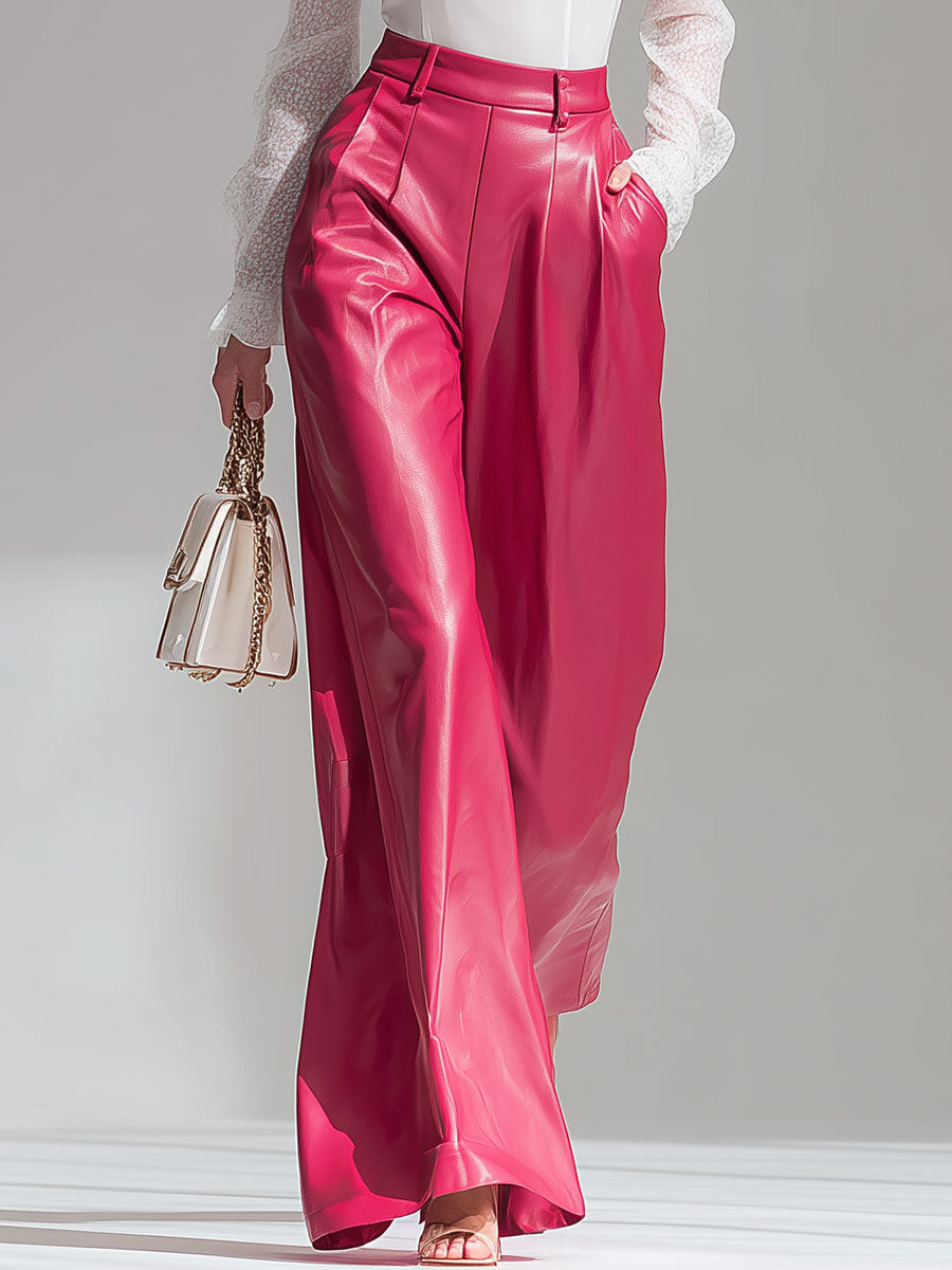 Stylish Loose-fitting Pink Faux Leather Pants