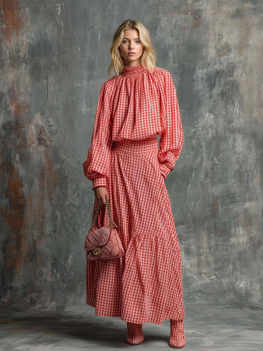 Retro Elegant Plaid Shirt And Skirt Set
