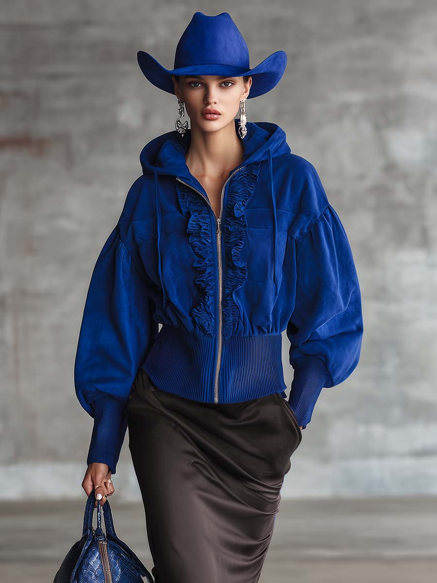 Vintage Elegant Ruffled Front Zip-up Royal Blue Suede Hooded Jacket