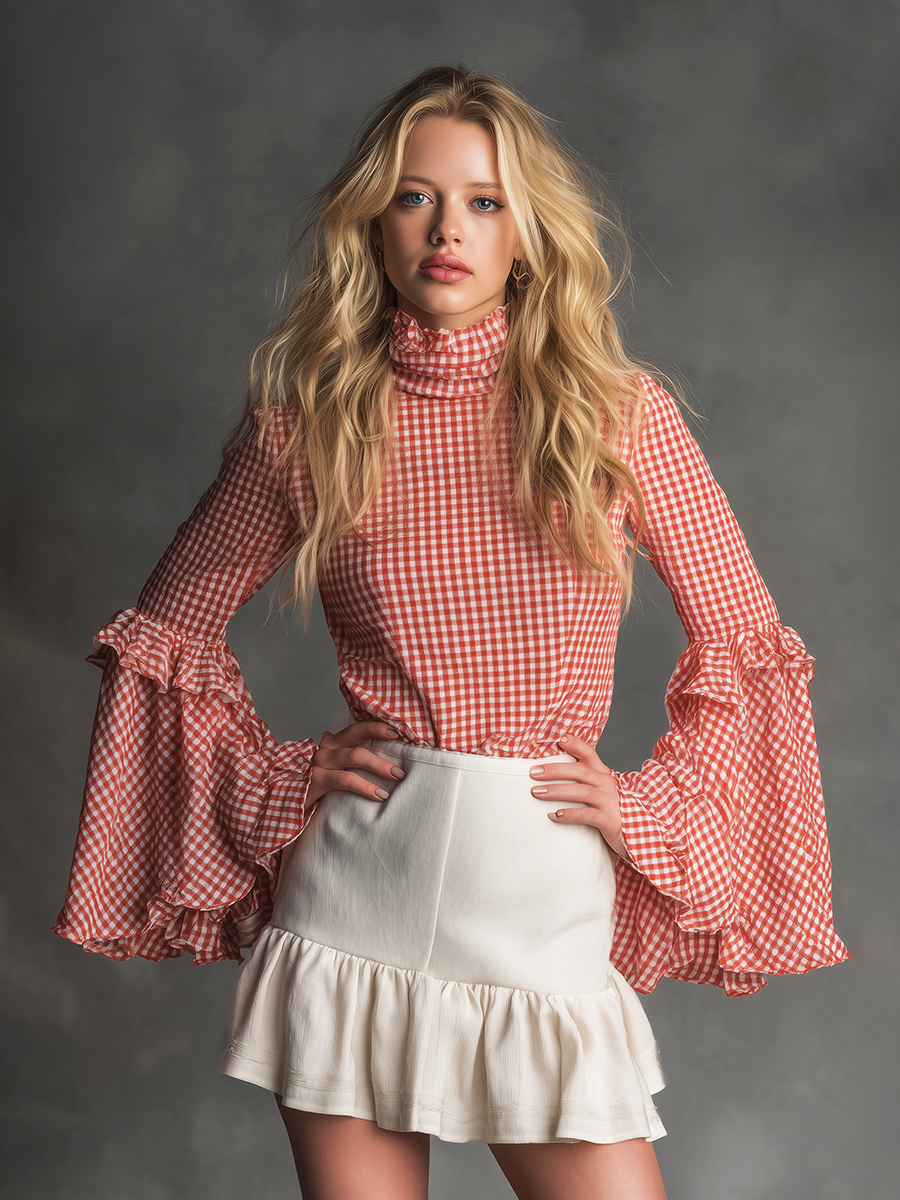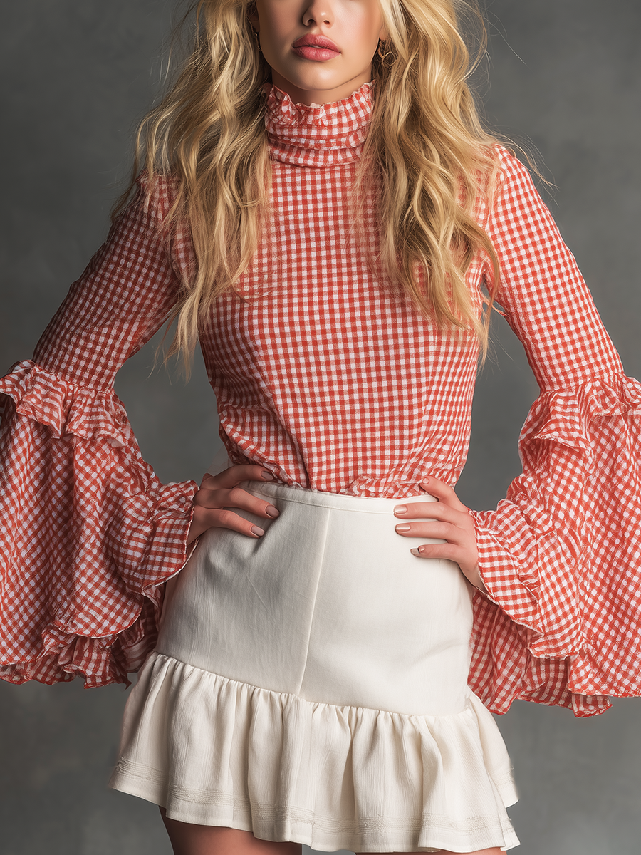 Retro Elegant Plaid Bell Sleeve Shirt