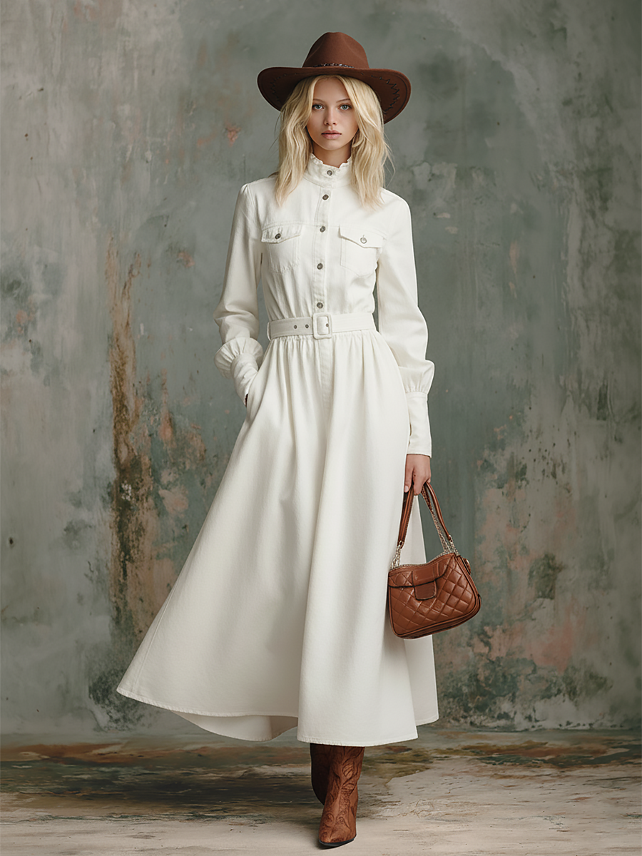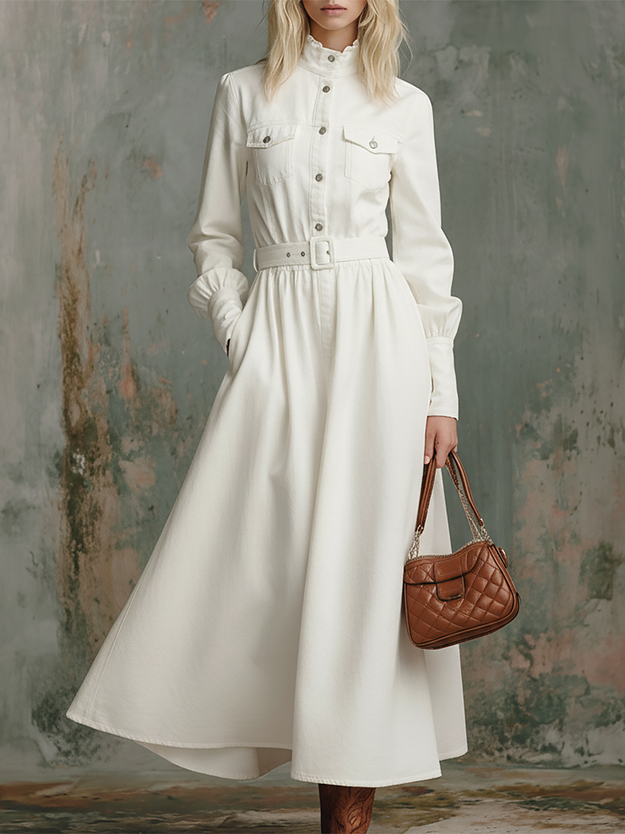 Elegant Retro Solid Color Stand Collar Long Sleeve Denim Maxi Dress