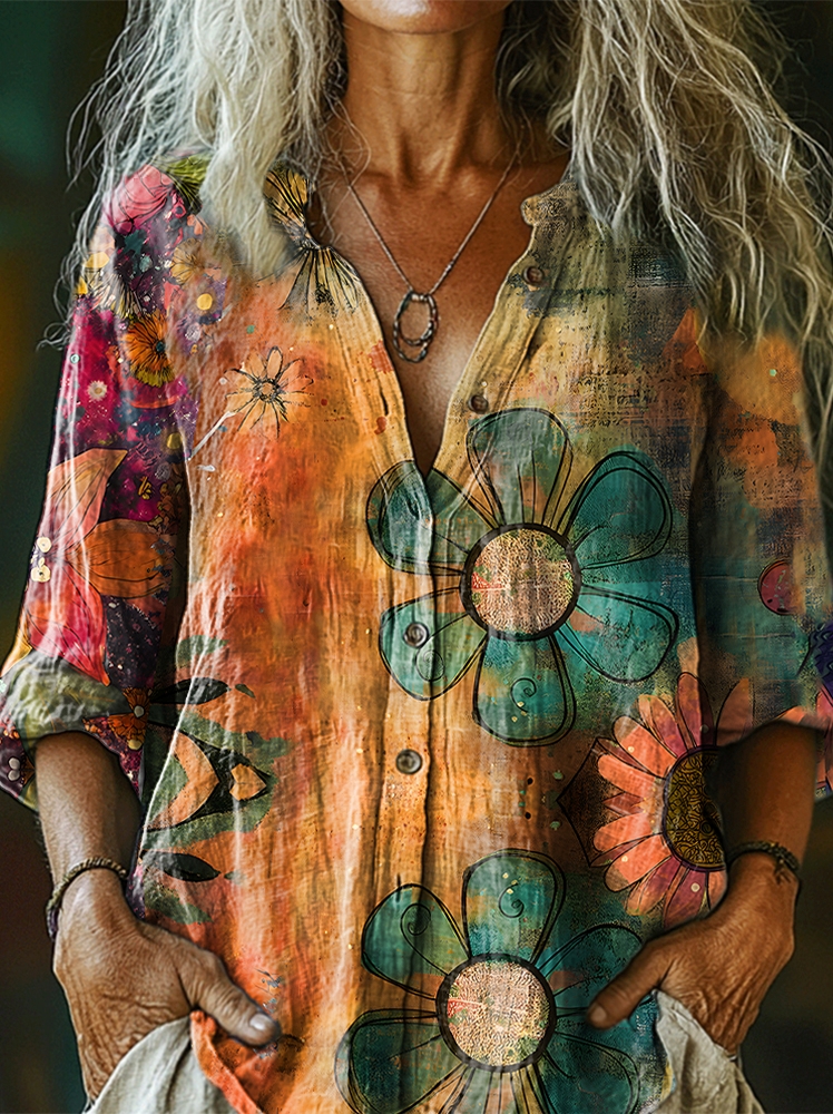 Women's Hippie Floral Art Print Casual Cotton Linen Shirt